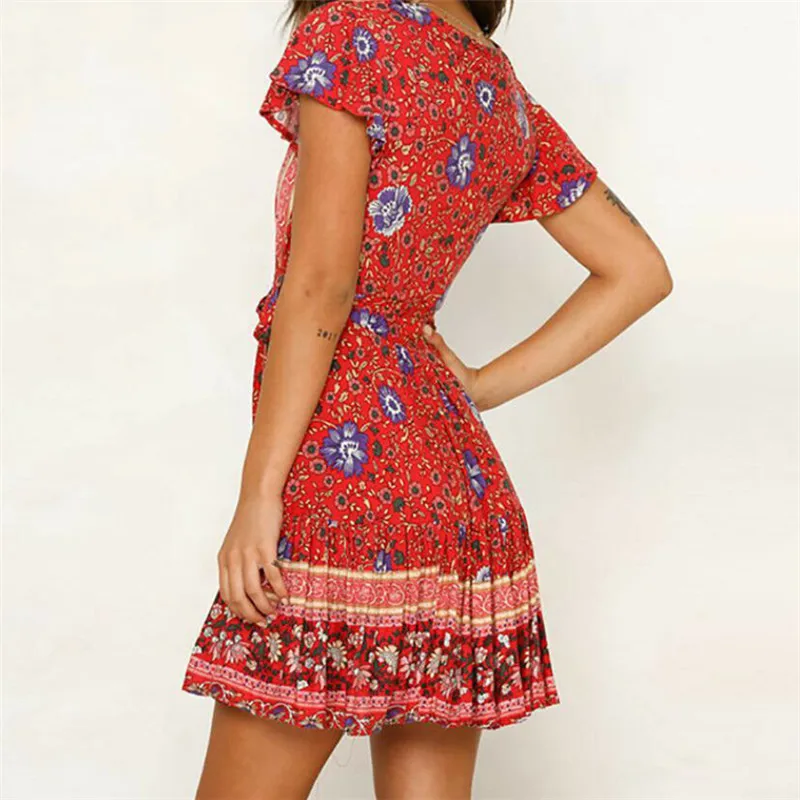 Летнее женское платье с коротким рукавом, Пляжное праздничное платье с глубоким v-образным вырезом и цветочным принтом в стиле бохо, летнее платье для женщин, Vestidos!