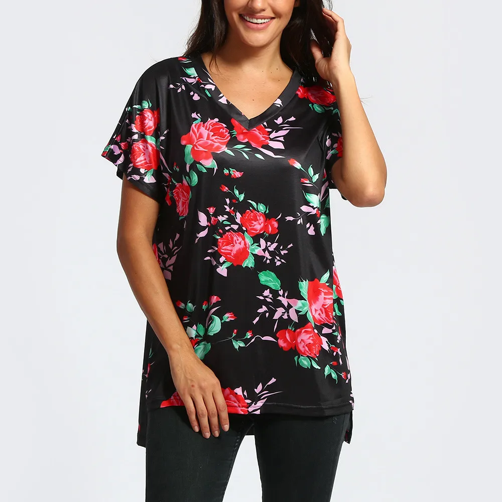Женская Свободная Повседневная футболка с коротким рукавом с v-образным вырезом и цветочным принтом