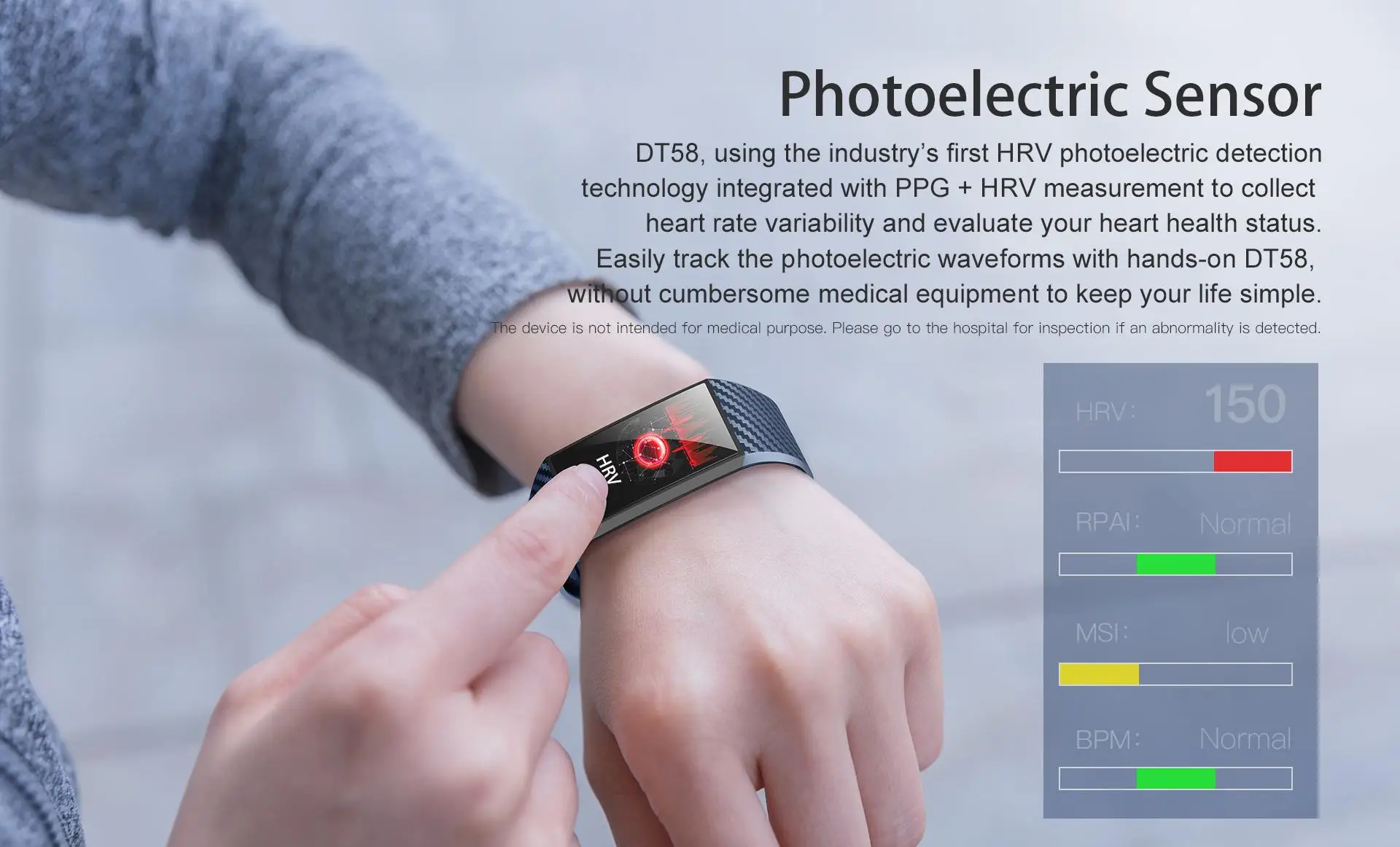 DT58 pro, используя первую в отрасли технологию фотоэлектрического обнаружения HRV, интегрированную с измерением PPG + HRV для сбора вариабельности сердечного ритма и оценки состояния здоровья вашего сердца.