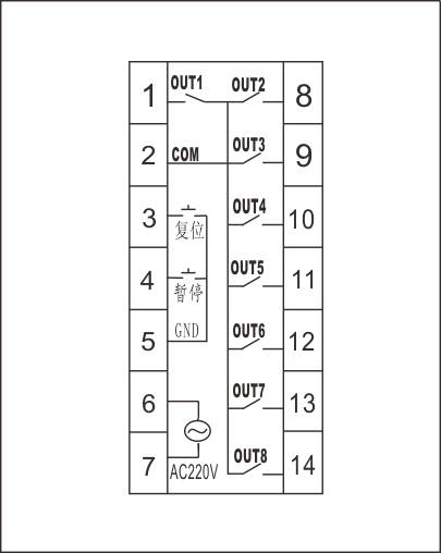 Есть четыре рабочих режима для каждого маршрута:0 режим:Задержка отключения: после запуска, реле немедленно отсасывает, и реле отключено и прекращено после того, как время задержки T1 прибывает. T1 время может быть установлен между 0,01 секунд и 9999 часов.1 режим:Задержка всасывания: после включения реле сначала не всасывает. После запуска реле отсасывает после задержки времени прибытия и окончания T1. T1 время может быть установлен между 0,01 секунд и 9999 часов.2 режима освещения:После запуска реле немедленно отсасывает, задерживает время T1, чтобы прибыть до отключения Реле, а затем задерживает время T2, чтобы прибыть после конца. Количество циклов может быть установлено между 0 и 9999, и 0-это бесконечный цикл. T1 времени и T2 время может быть установлен между 0,01 секунд и 9999 часов.3 режима:Задержка всасывания и задержка отключения: после включения реле сначала не всасывает. После запуска и задержки поступления времени T1 реле не отсасывает. После задержки времени T2 реле отключается. Количество циклов может быть установлено между 0 и 9999, и 0-это бесконечный цикл. T1 времени и T2 время может быть установлен между 0,01 секунд и 9999 часов.Примечание: T1 указывает первый период, а T2-второй период.Режим запуска 1: контроллер может быть настроен для включения питания (контроллер начнет работать немедленно, когда он будет электрифицирован)2: можно установить, что сброс должен быть сгенерирован нажатием, чтобы запустить контроллер.Каждый маршрут может выбрать начальную точку работы:Маршрут 1: начните вводить состояние синхронизации.Маршрут 2: 1. Он может войти в состояние синхронизации в начале запуска.(2) Он может начать вводить состояние синхронизации только после первого времени 1-го маршрута T1 или T2.(3) он может войти в состояние синхронизации только после завершения первой работы маршрута.Маршрут 3: 1. Он может войти в состояние синхронизации в начале запуска.(2) Он может войти в состояние синхронизации только после первого времени первого T1 или T2.(3) он может войти в состояние синхронизации только после завершения первой работы маршрута.(4) Он не может войти в состояние синхронизации до конца второго времени T1 или T2.(5) он может войти в состояние синхронизации только после завершения работы Второго маршрута.Маршрут 4: 1. Он может войти в состояние времени человека в начале.(2) Он может войти в состояние синхронизации только после первого времени первого T1 или T2.(3) он может войти в состояние синхронизации только после завершения первой работы маршрута.(4) Он не может войти в состояние синхронизации до конца второго времени T1 или T2.(5) он может войти в состояние синхронизации только после завершения работы Второго маршрута.Он может войти в состояние синхронизации только после завершения первого времени маршрута 3 T1 или T2.Он может войти в состояние синхронизации только после завершения работы Третьего маршрута. Маршрут 5: 1. Он может войти в состояние времени человека в начале запуска. (2) Он может войти в состояние синхронизации только после первого времени первого T1 или T2. (3) он может войти в состояние синхронизации только после завершения первой работы маршрута. (4) Он не может войти в состояние синхронизации до конца второго времени T1 или T2. (5) он может войти в состояние синхронизации только после завершения работы Второго маршрута. Он может войти в состояние синхрониз