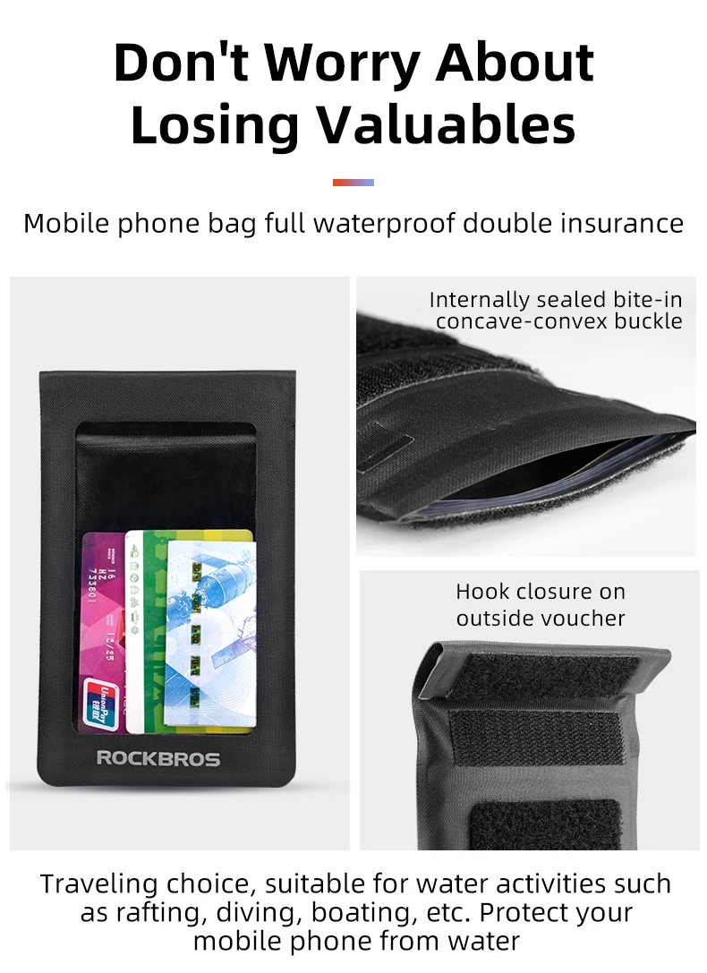 Состояние: абсолютно новый Цвет: черный Подходит для: под 6,0 дюймов чехол для телефона Вес: около 250 г Для: MTB, Велоспорт, путешествия, дрейфующие, катание на лодках, рыбалка Название: ROCKBROS Водонепроницаемая велосипедная сумка серии: W Серия 2017