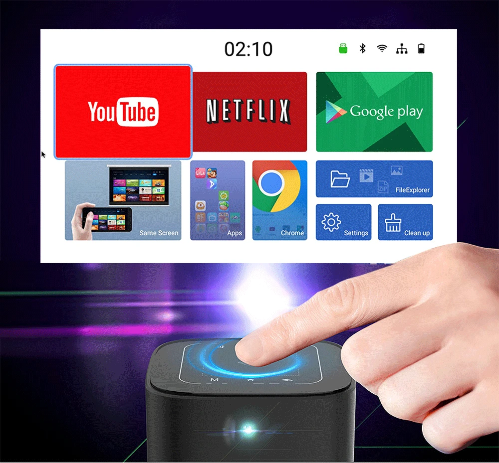 Интуитивно понятный и сенсорный, вы можете управлять проектором только одним пальцем на сенсорной панелиЯСенсорный экран ts позволяет выбрать носитель, Приложения и многое другое благодаря простоте нажатия