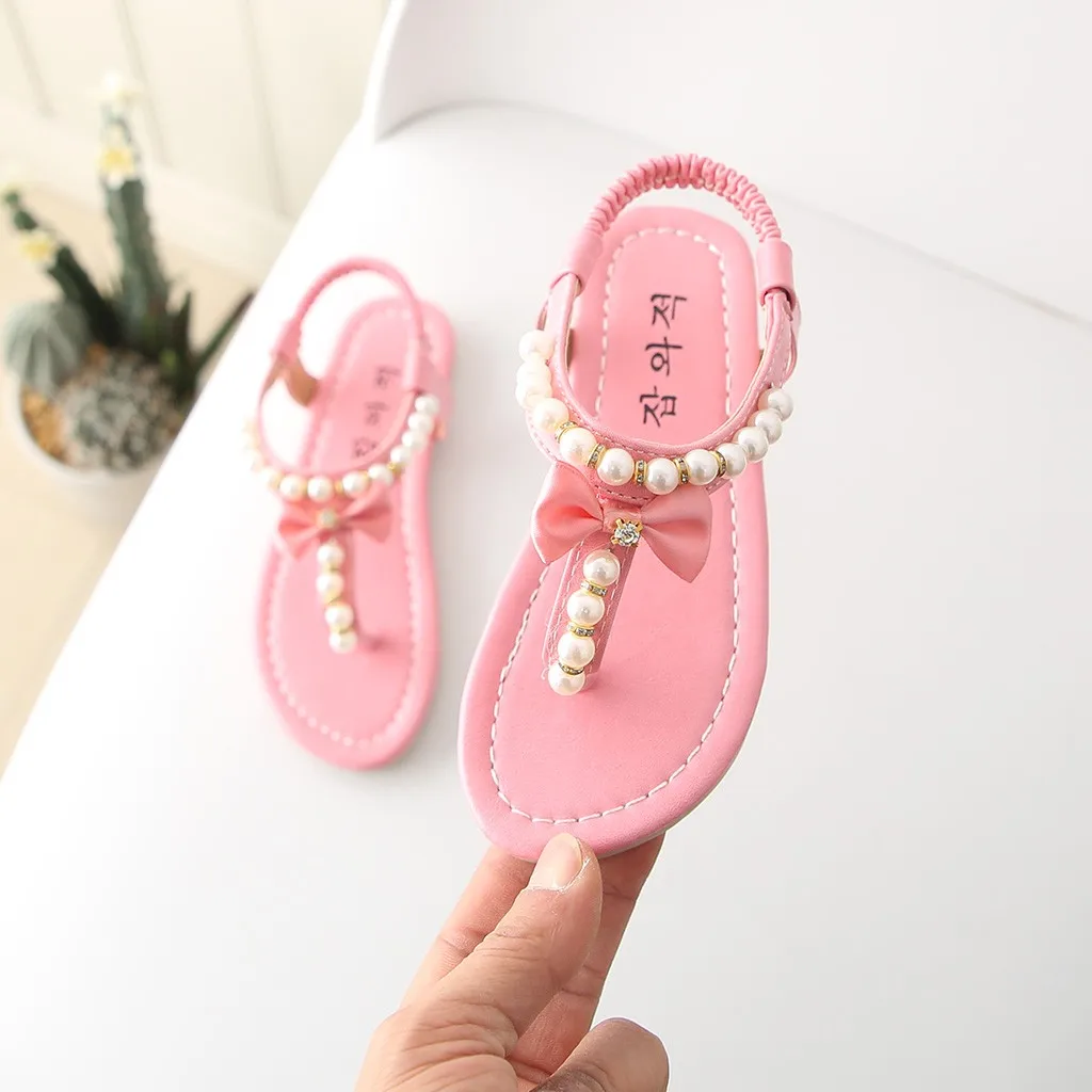 Обувь для маленьких девочек; Детские летние туфли принцессы с бантом и жемчужинами; Тонкие повседневные сандалии для маленьких девочек