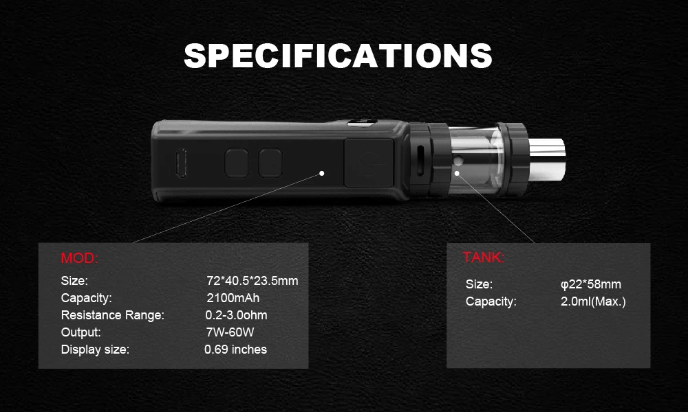 -Контроль температуры 300-600F, -Переменная мощность до 60 Вт, -Поддержка VT-Ti/VT-Ni/VT-SS316L/VT-NiCr/VW, -Емкость бака 2 мл -0,69 дюймовый oled-дисплей -Топ заполняющий бак subohm