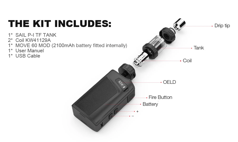 Move 60 KIT: 1 * парус P-1 TF бак 2 * Катушка KW41129A 1 * Move 60 Mod (2100 мАч встроенный аккумулятор) 1 * USB кабель 1 * Руководство пользователя Move 60 MOD: 1 * Move 60 Mod (2100 мАч встроенный аккумулятор) 1 * USB кабель 1 * Руководство пользователя