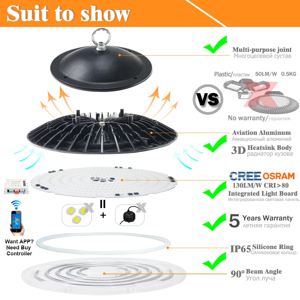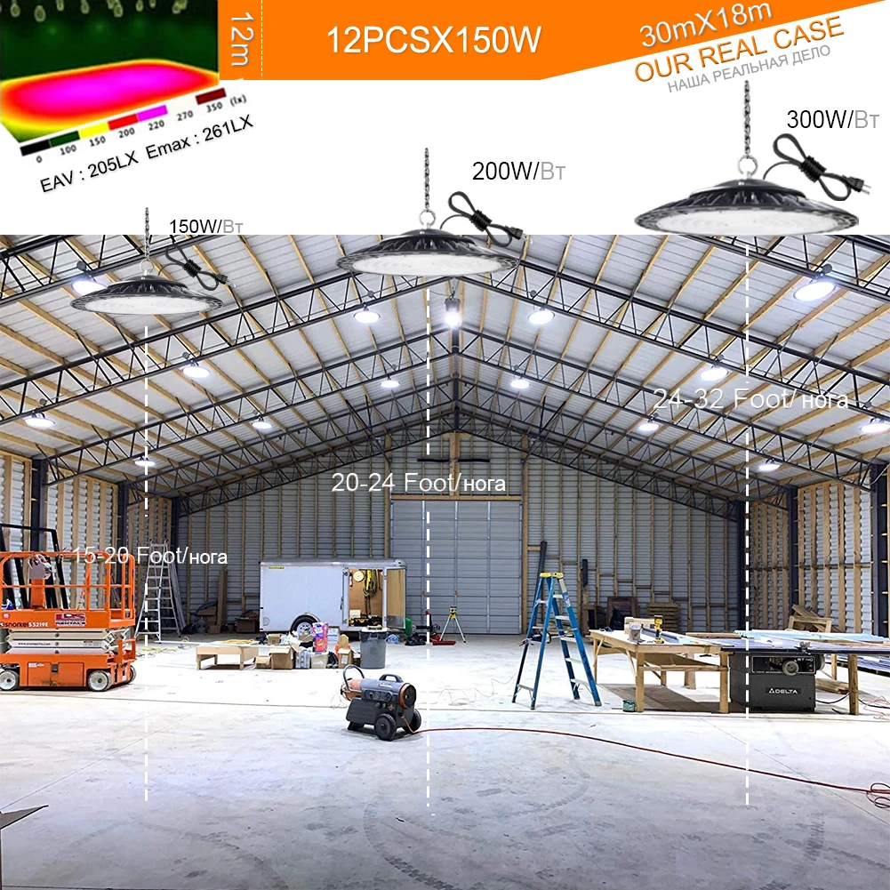150W -17600LM 144 светодиодов, 1 Вт SMD США CREE или Германии Osram Чип Рекомендуем: высота 15-20ft, диаметр 36ft 200W -26700LM 216 светодиодов, 1 Вт SMD США CREE или Германии Osram Чип Рекомендуем: высота 20-24ft, диаметр 42ft 300W -31200LM 288 светодиодов, 1 Вт SMD Сша CREE или германии Osram чип Рекомендуем: высота 24-32ft, диаметр 48ft