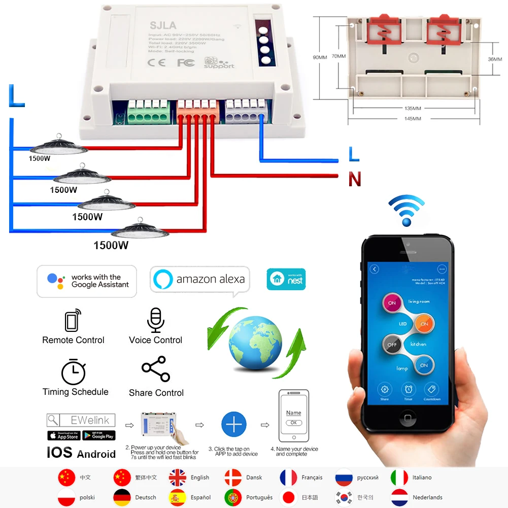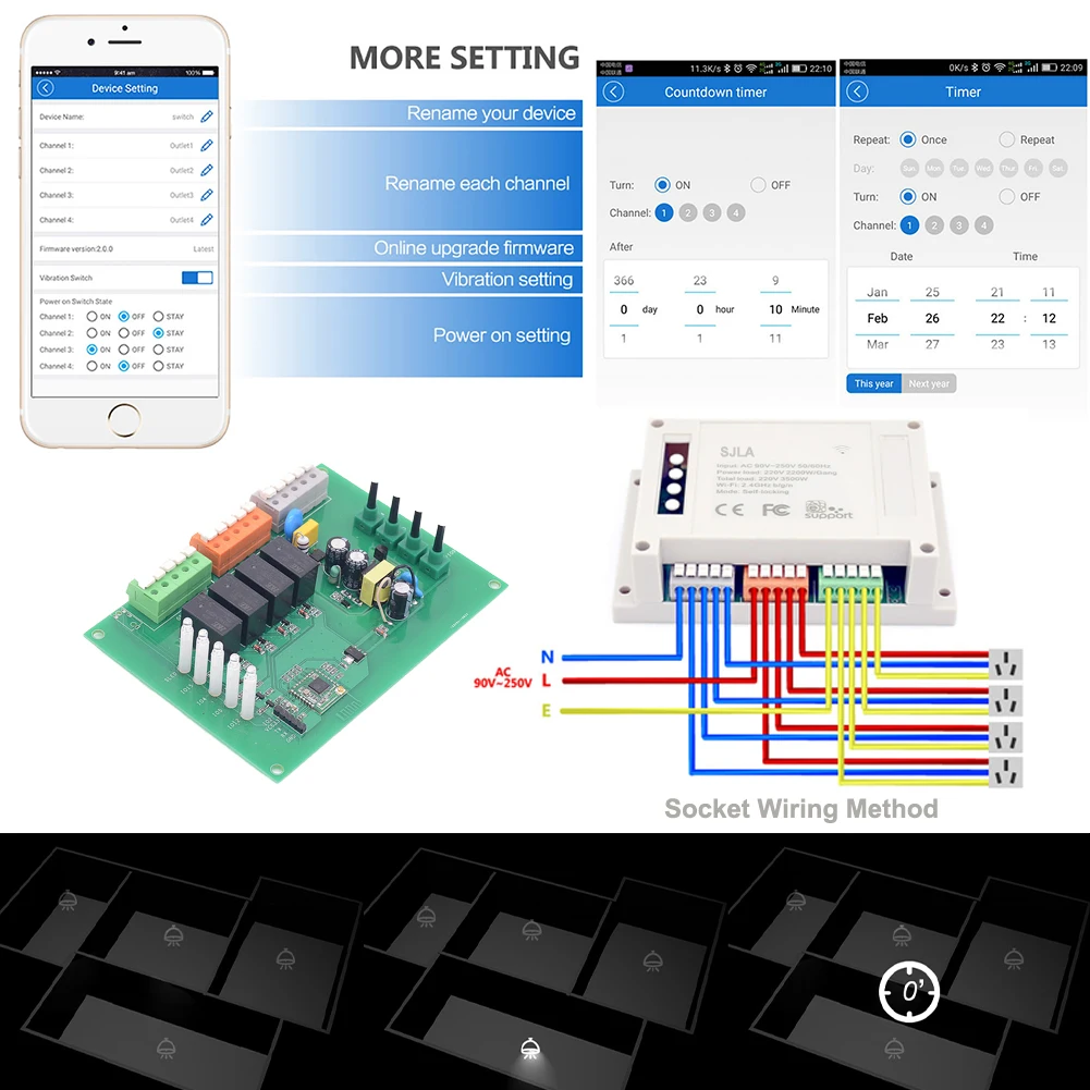 > SJLA Smart APP Wi-Fi переключатель; > Поддерживает сети Wi-Fi; > Бесплатное приложение для IOS и Android mobile; > Контролировать каждый пост управляется отдельно; > Контроль вашего умного дома вместе со своей семьей; > Поддерживает Статус устройства в реальном времени отображается при условии в приложение; > Поддерживает поворот/выключение электрических устройств в любом месте; > Таймеров на определённое время/Обратный отсчёт для включения/выключения в указанное время; > Поддержка max 8 с поддержкой по расписанию/обратного отсчета/таймеры для каждого устройства; > Поддерживает множество Wi-Fi умные выключатели на один смартфон (вы только в том случае, если вы хотите сделать устройств в приложении); > Работает с функцией Voice Amazon Alexa,Echo, Echo Dot, Amazon Tap; > Работает с функцией Voice Google Assistan/Home/Nest; > Работает с IFTTT. > И т. д...