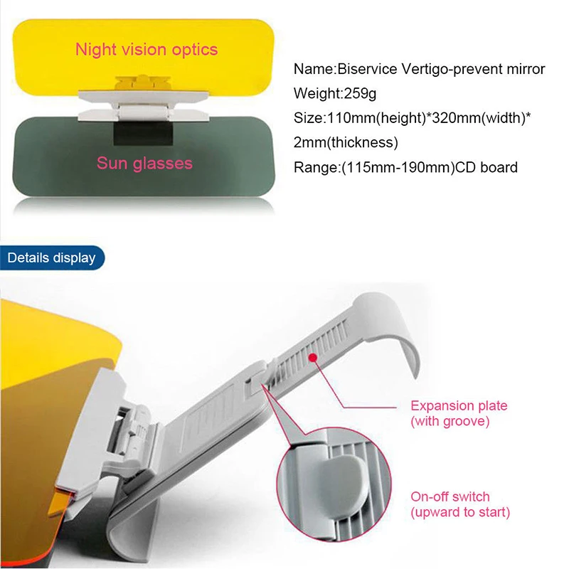 Item Details: *Car HD Anti-Glare & Dazzling Goggle Day Night Vision Driving Sun Visors Mirror *Can protect you from infrared UV rays and gives you better visibility while driving *Particularly useful in low winter sunshine when existing sun visor is inadequate *Also helps against sudden glare from bright sunshine *Telescopic automatic fastener *Forward and backward adjustable & flipping *Integral gear type design, anti-vibration *Easy to install *100% brand new and high quality *Material: PC, PMMA *Color: Yellow, Transparent Gray (As Pictures Show) *Dimension (H*W*T): 110*320*2mm/4.3*12.6*0.08'' (Approx.) *Range: 115~190mm CD Board Warm Tips: Folds for neat storage when not in use Package Contents: 1*Sun Visor Mirror Note: The real color of the item may be slightly different from the pictures shown on website caused by many factors such as brightness of your monitor and light brightness.