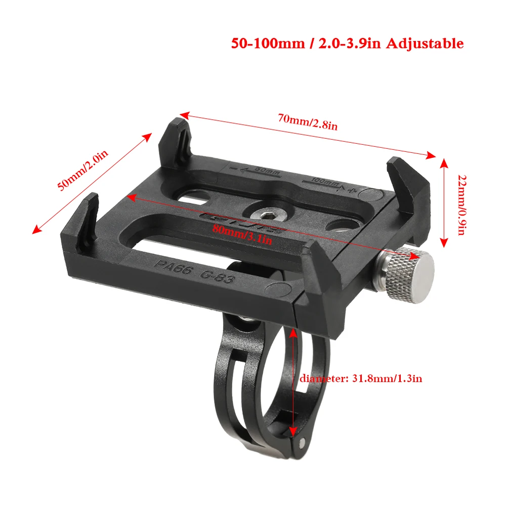 Это крепление для мобильного телефона велосипеда регулируется в длину от 50 мм до 100 мм, чтобы соответствовать размеру мобильного телефона от 3,6-6,2 дюйма. Он изготовлен из высокопрочного пластика и алюминиевого сплава, подходит для диаметров руля 31,8 мм/25,4 мм/22,2 мм.