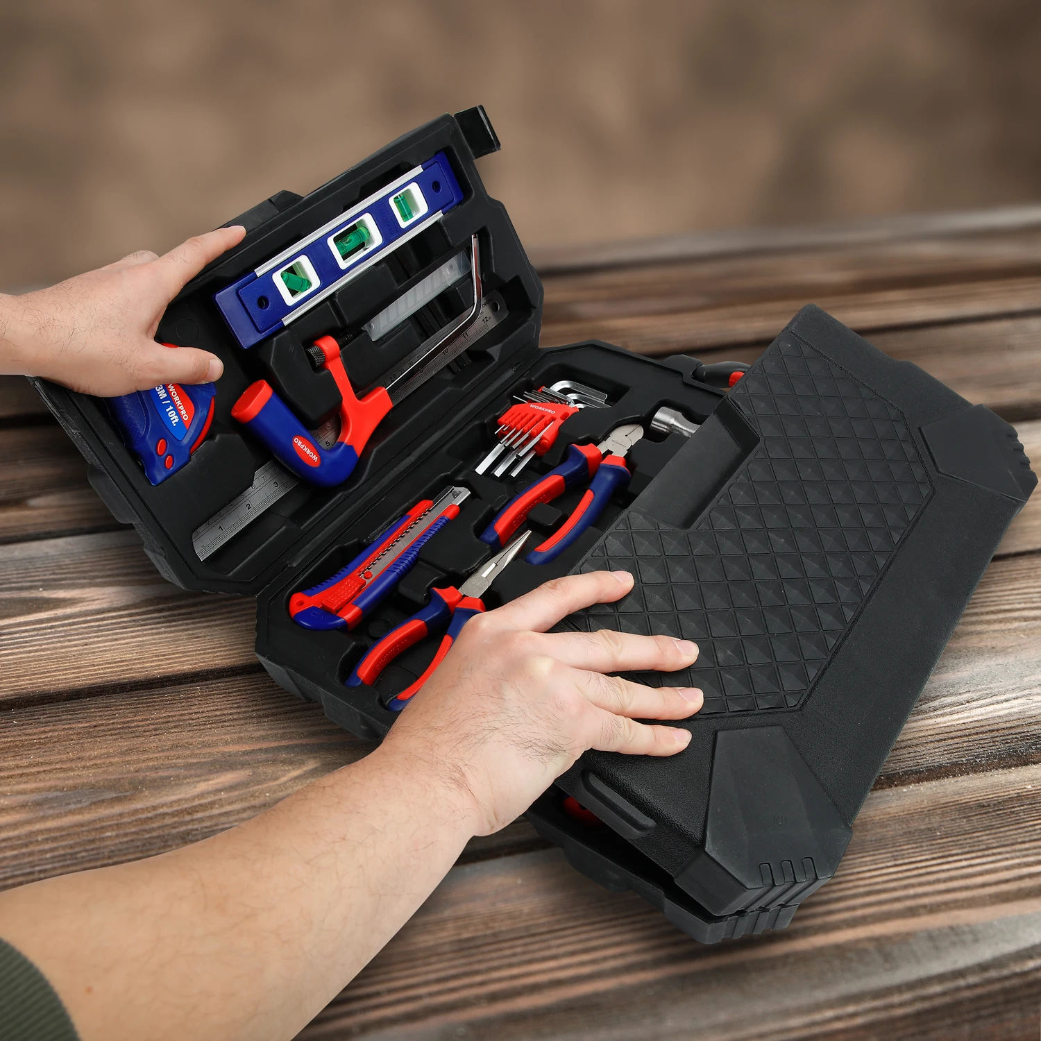 Идеально подходит для ежедневного обслуживания дома: Со всеми наиболее полезные и необходимые инструменты для ежедневного использования, набор идеально подходит для DIY или домашнего ремонта и обслуживания дома, а также идеально подходит для подарка на Рождество или день рождения Высокое качество: Он изготовлен из углеродистой стали и cr-v, высококачественный материал обеспечивает долговечность и прочность инструментов, эргономичная ручка позволяет вашей работе более комфортной и безопасной Набор инструментов из 77 предметов: Этот набор инструментов включает в себя: молоток, рулетку, метрическую отвертку, Набор плоскогубцев, гаечные ключи, металлическую пилку, ножовку... Чехол для хранения компактного инструмента: Размер: 37,5x8x36,5 см, прочная пластиковая коробка делает каждый инструмент в порядке и удобен для хранения и переноски Отлично подходит для специалистов и начинающих: Этот базовый набор инструментов отлично подходит для всех, от любителей до собственников дома. Это идеальный стартовый набор для начинающих разнорабочих, а также дополнение для профессионалов по ремонту.