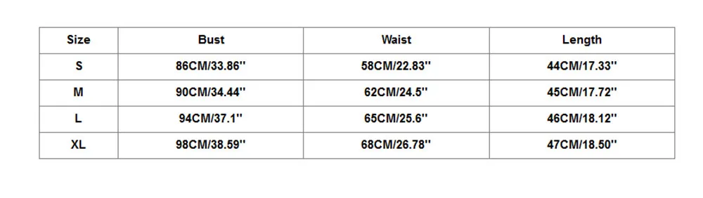 Размер Бюст Талия Длина S 86 см/33,86'' 58 CM/22,83'' 44 см/17,33'' М 90 см/34,44'' 62 см/24,5'' 45 см/17,72'' L 94 см/37,1'' 65 см/25,6'' 46 CM/18,12'' XL 98 см/38,59'' 68 см/26,78'' 47 см/18,50''