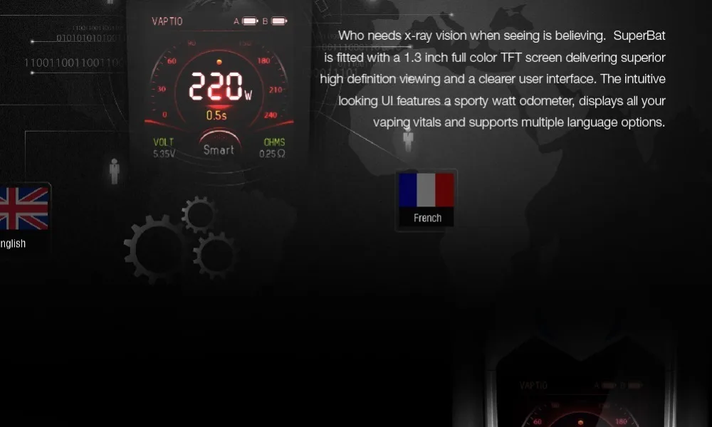 С суперкрутым внешним видом летучей мыши, Набор super bat 220 W-это многоцелевой набор для вейпа с мощной производительностью и квалифицированным дизайном изготовления. Питание от двух аккумуляторов 18650, модуль SuperBat поддерживает максимальный выход 220 Вт с передовыми модами VW/TC для сверхмощного парения. Он также оснащен супер крутой системой светодиодного освещения, 1,3-дюймовым экраном высокой четкости с контролем пальца, чтобы обеспечить вам крутую и легкую операционную систему.