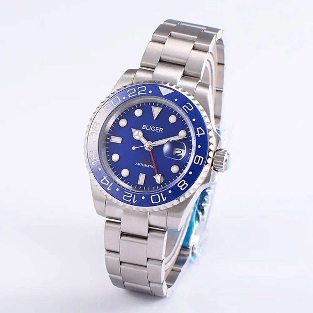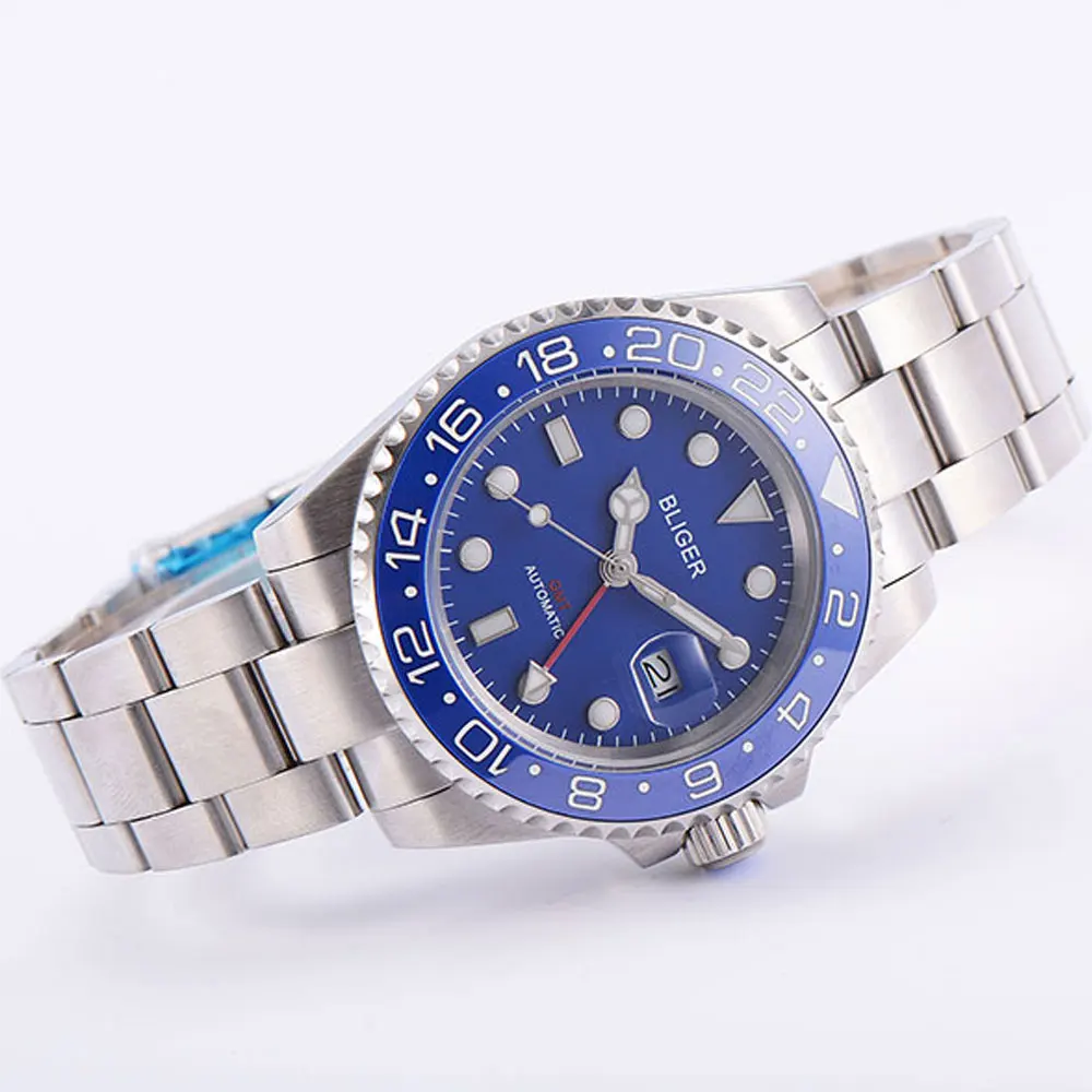 Механизм: функция GMT Циферблат: синий циферблат; Светящиеся стрелки и отметки; Керамический ободок Материал корпуса: твердый корпус из нержавеющей стали 316L. Водонепроницаемость 30 м. Размер Чехла: диаметр: 40 мм; Толщина: 14 мм. Ремешок: ремешок из нержавеющей стали 20 мм. Тип застежки: раскладная застежка из нержавеющей стали. Стекло: сапфировое стекло. Функция: Дата, керамика вращающаяся рамка.