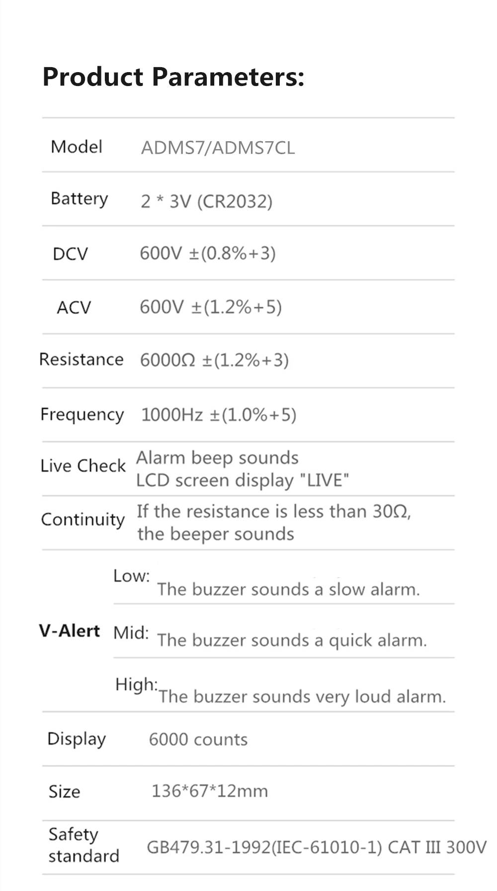 Поколение: выпуск 7-го поколения-2019 Дисплей: 6000 штук Напряжение постоянного тока: 600 В ±(0.8% + 3) Напряжение переменного тока: 600 В ±(1.2% + 5) Сопротивление: 6000Ω ±(1.2% + 3) Частота: 1000 Гц ±(1.0% + 5) V-Alert (Бесконтактное Обнаружение напряжения): [Низкий диапазон]: звуковой сигнал звучит медленно. [Средний диапазон]: звуковой сигнал выдает Быстрый сигнал. [Дальность действия]: звуковой сигнал очень громкий сигнал. Проверка в режиме реального времени: звуковой сигнал тревоги, ЖК-дисплей «Live» Непрерывность: если сопротивление менее 30 Ом, звуковой сигнал Мощность: 2*3 в (CR2032)-включает Размер: 136*67*12 мм Вес: 110 г