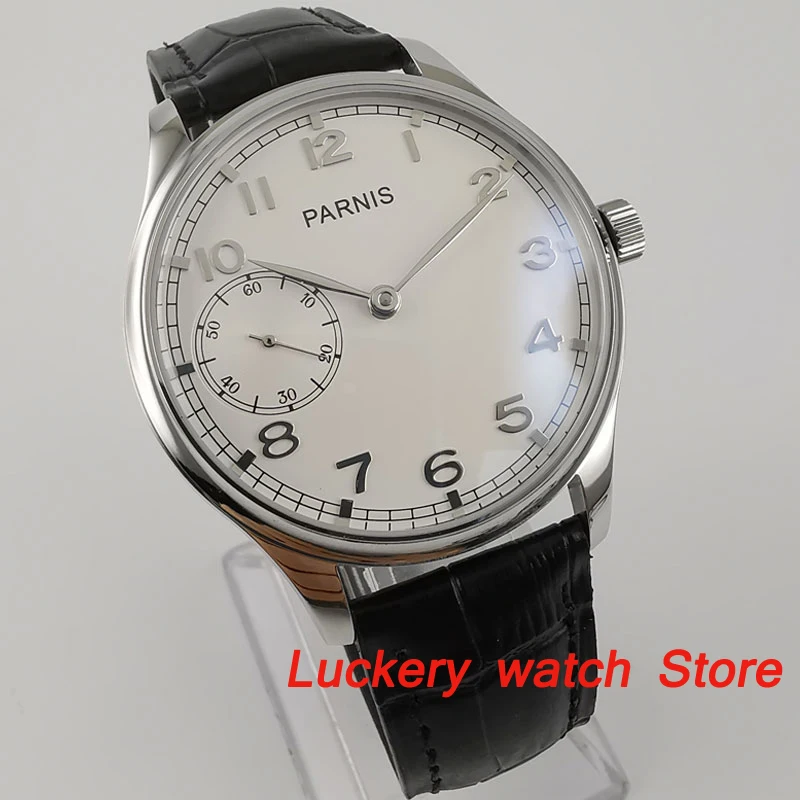 Механизм: 17-Jewels механические 6497 ручным заводом. Циферблат: белый циферблат с серебристыми стрелками, секундные стрелки в положении 9 часов. Чехол: полированный Твердый чехол из нержавеющей стали 316L. Водонепроницаемость 30 м. Чехол диаметр: 44 мм. Чехол Толщина: 11 мм. Ремешок: 22 мм ширина кожаный ремешок. Тип застежки: пряжка на булавке. Стекло: специальное устойчивое к царапинам стекло.