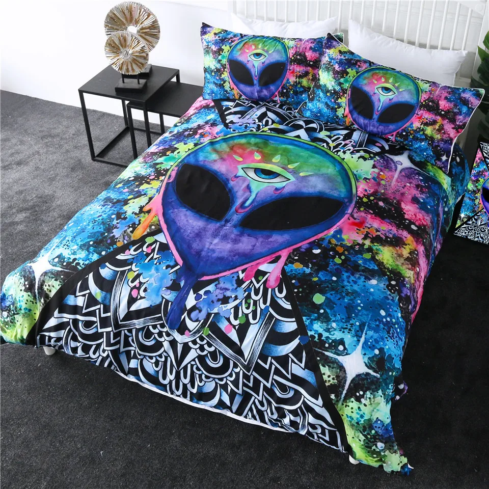 Название товара:Комплект постельного бельяУпаковочный лист:1 * пододеяльник + 2 * наволочкиТкань:ПолиэстерСезон:Весна, лето, осень, зимаОсобенности:Красочный комплект постельного белья alien разработан Brizbazaar, наш комплект с пододеяльником наполнит вашу спальню художественным ощущением.Рекомендации по уходу за постельным бельем:1) Если для сочетания Вам дополнительно требуется простынь, пожалуйста, свяжитесь с нами.2) Пододеяльник без внутреннего наполнения используется в качестве чехла для пухового или лоскутного одеяла.3) Из-за разницы в освещении и экранах, цвет изделия может слегка отличаться от цвета на фотографиях.4) В виду того, что это ручная работа портного, допускается отклонение в размере 3-5 см.