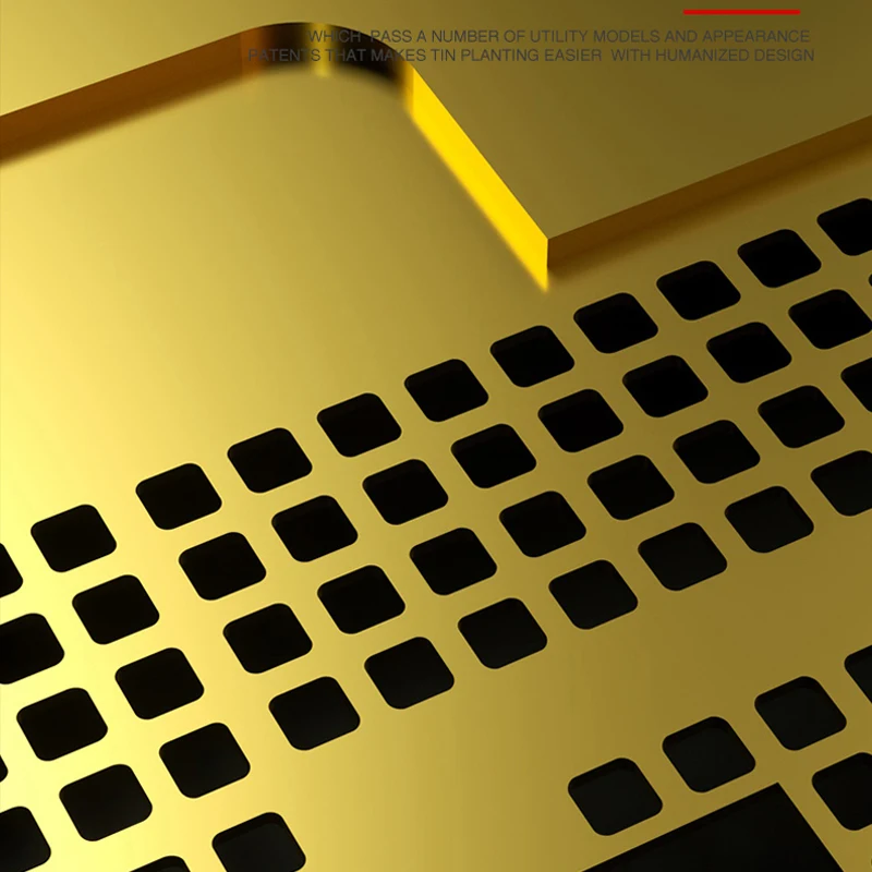 Сетка апплицирует новейший Высокоточный специальный srface процесс золотого покрытия с функцией анти-окисления Высокая термостойкость 700 градусов по Цельсию, без выпуклости, без деформации Толщина всего сетка 0,3 мм Толщина паза 0,18 мм Толщина законсервированное растение толщина составляет 0,12 мм