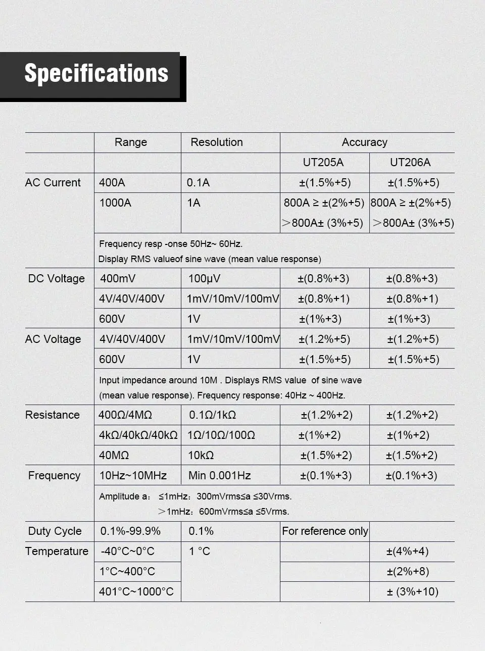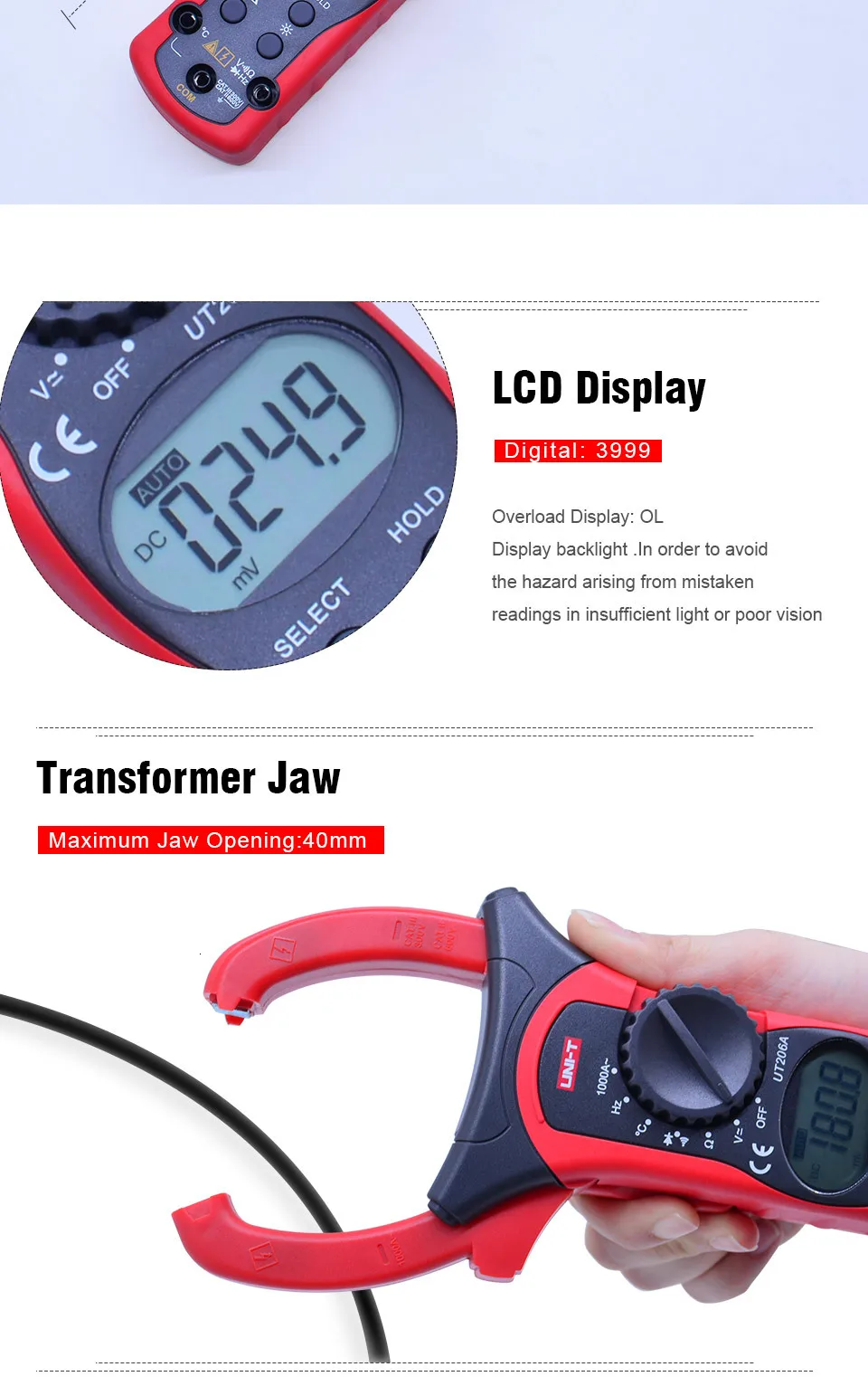 UT205A/206A профессиональные 1000A цифровые клещи с 40 мм щетиной. Эта серия имеет эргономичный дизайн, что позволяет лучше обращаться с пользователями в электрических перчатках. UT205A/206A-отличный выбор для электриков и других профессионалов, которые нуждаются в измерении до 1000A переменного тока.