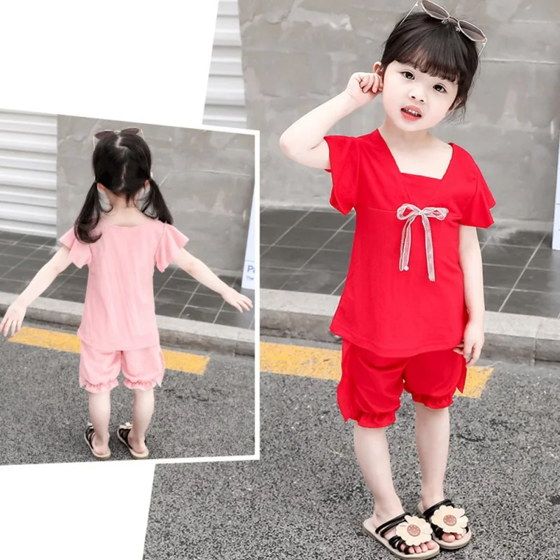 Повседневный стиль, расклешенный рукав, комплект из однотонной футболки с бантом и шорт, что сделает ваших детей классными и привлекательными