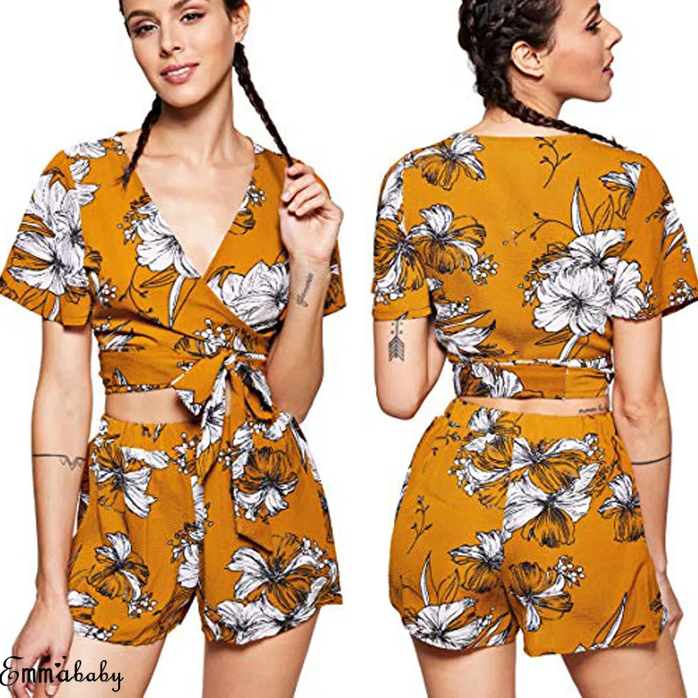Новинка в моде, женский модный цветочный принт, бандаж, v-образный вырез, укороченный топ и шорты