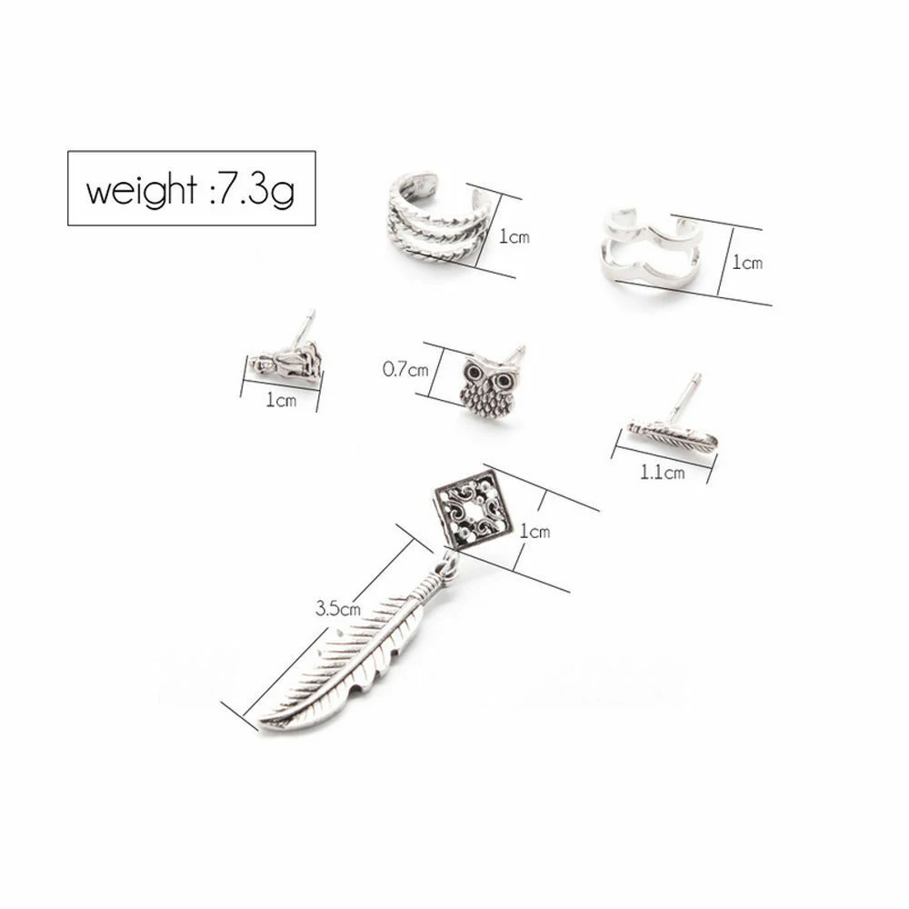 6 шт. Bohemia женское 2019 новое кольцо для пирсинга набор серег-подвесок с ушками в виде листьев совы ретро сереброПараметры: