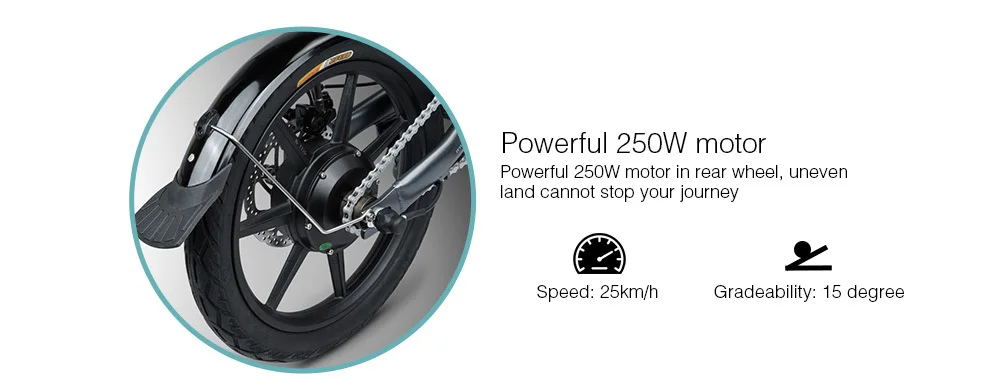 ● Двигатель мощностью 250 Вт обеспечивает максимальную скорость 25 км/ч и максимальный градиент 15 градусов