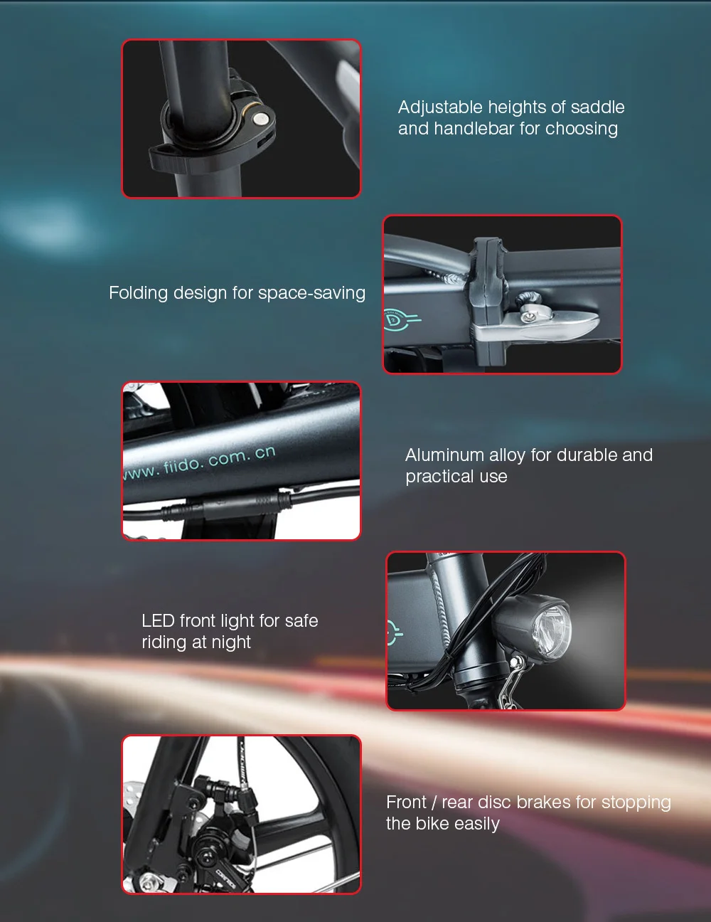 Содержимое упаковки: Электрический велосипед FIIDO-1 шт., ключ-1 шт., зарядное устройство с вилкой европейского стандарта-1 шт., 1 х Руководство пользователя на английском языке