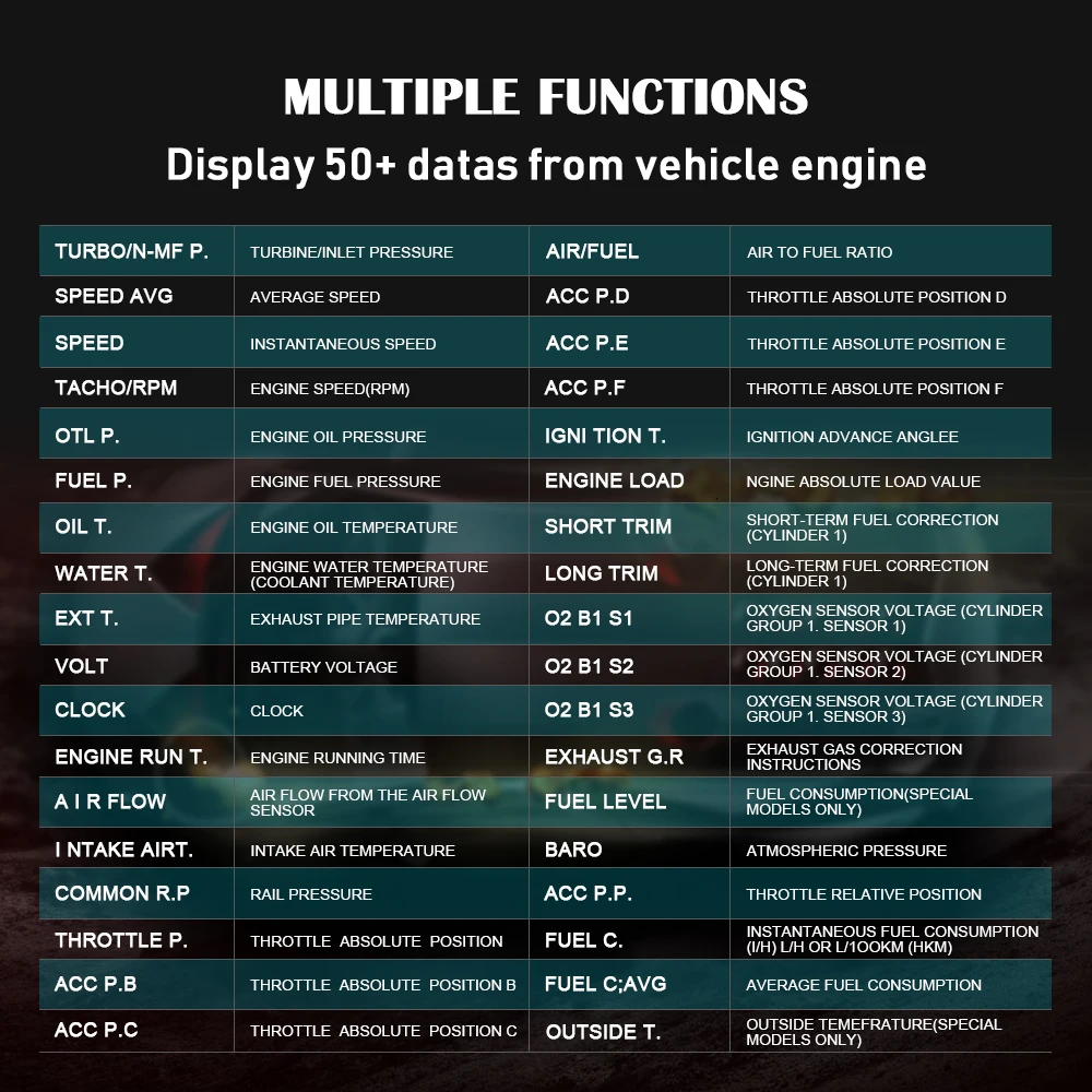 3. дополнительные функции: скорость вождения автомобиля, об/мин двигателя, температура воды, напряжение, мгновенный расход топлива, средний расход топлива, измерение расстояния вождения, время вождения, Сигнализация низкого напряжения, сигнализация с высокой температурой воды, сигнализация превышения скорости,