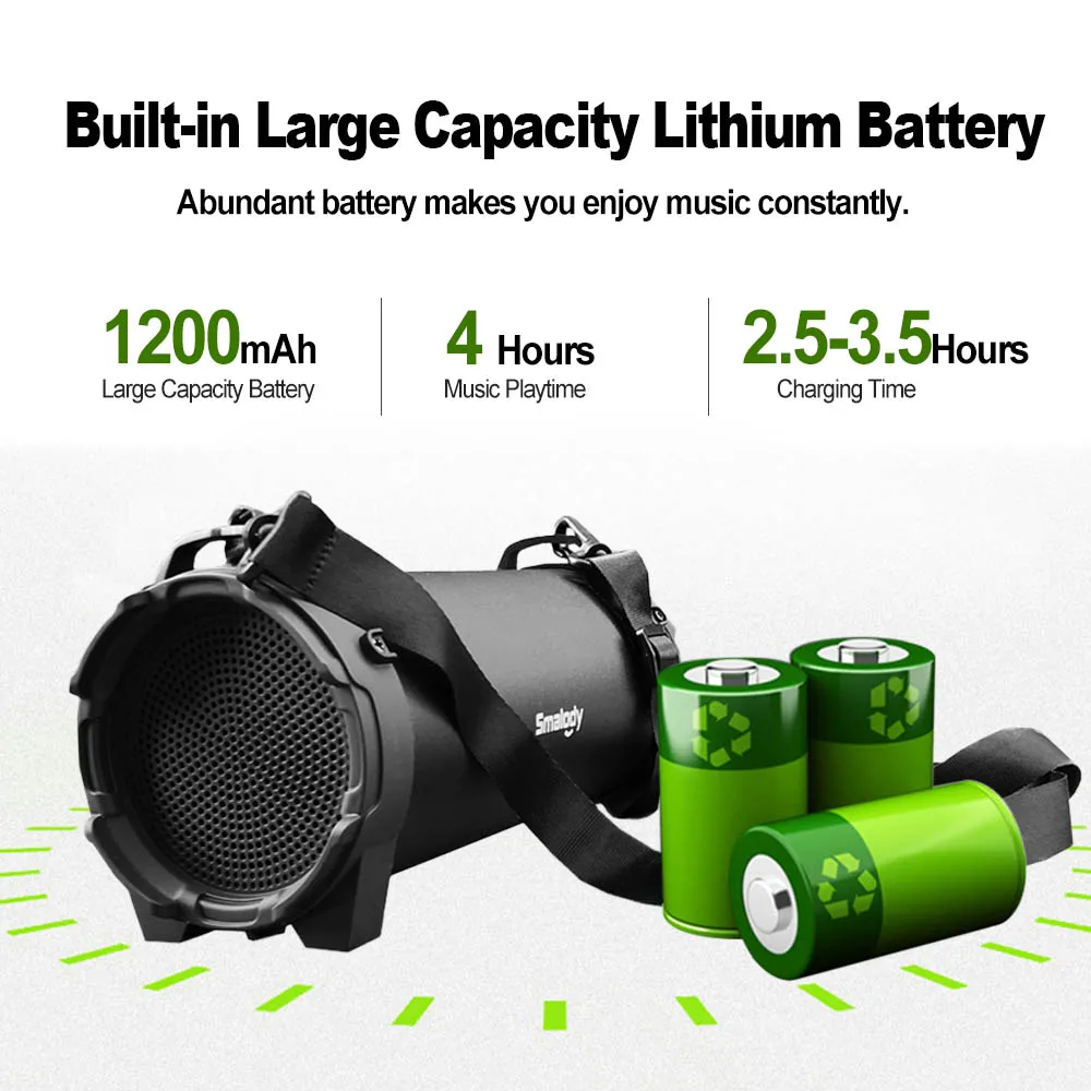 С регулируемым лямкой, легко носить с собой на открытом воздухе. Перезаряжаемая литиевая батарея емкостью 1200 мА · ч обеспечивает до 4 часов воспроизведения при 2/3 громкости при полной зарядке.