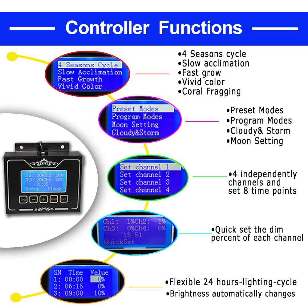 Новое обновление:Водонепроницаемый шнур, регулируемый по высоте, внешний источник питания, безопасный для использования, Интеллектуальный контроллер:Быстрый набор, предустановленные режимы, режимы программы, 4 самостоятельных канала затемнения и программируемые, настройка Луны, другое естественное моделирование, Шлейфового подключения:Умный программируемый контроллер может быть цепочкой маргаритки с большим количеством панелей,