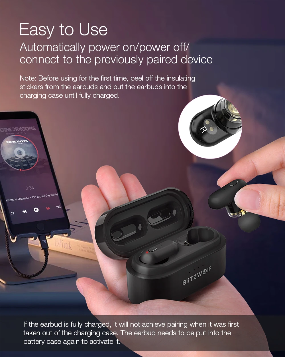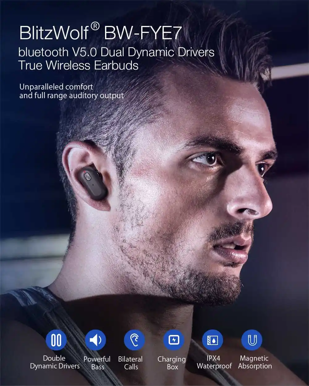 Бренд Blitzwolf модель BW-FYE7 цвет черный Тип ношения в ухе Материал PC + ABS Вес нетто (г) один наушник: 5g зарядный чехол: 5 5g Общий вес: 6 5g размеры зарядная коробка: 70*33*35,5 мм наушники: 26*13*30 мм