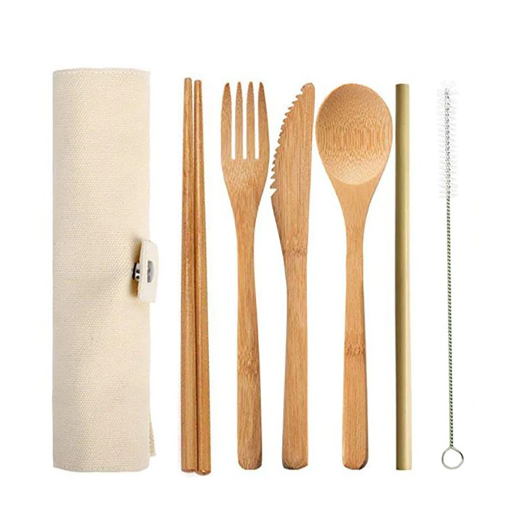 Набор бамбуковых столовых приборов можно использовать повторно, легко мыть и использовать непрерывно.