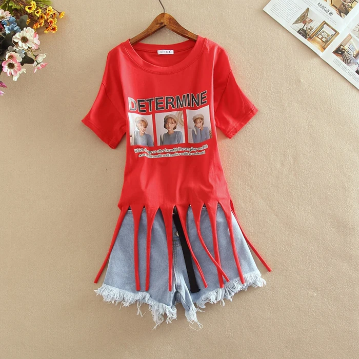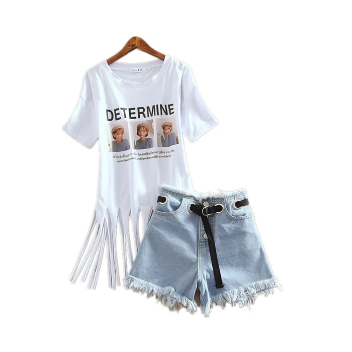 Женский джинсовый комплект из двух предметов, футболка с бахромой и коротким рукавом с принтом + джинсовые шорты с высокой талией, лето 2019