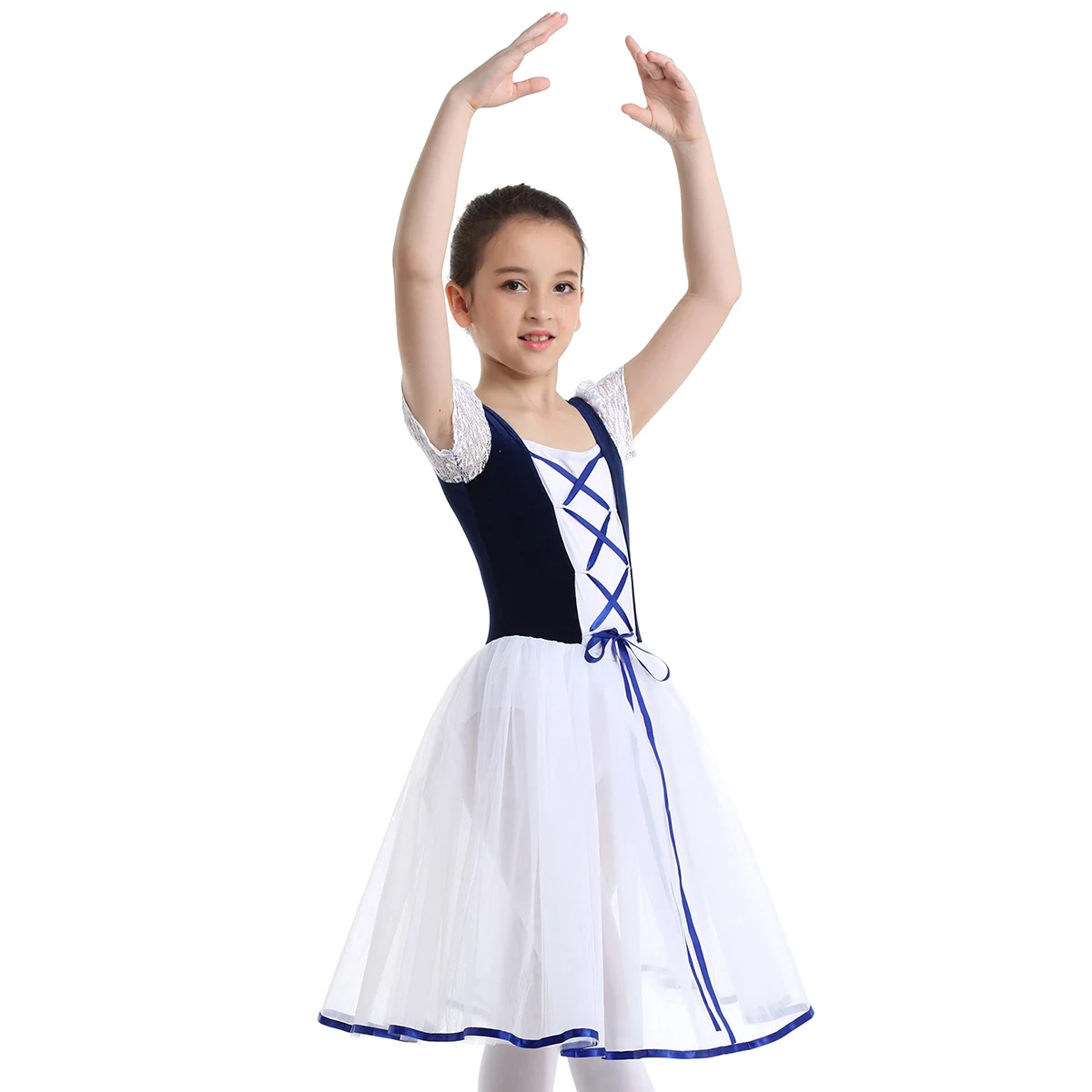 Балетное гимнастическое платье изготовлено из полиэстера, бархата и сетчатого материала, ручная стирка. Таблица размеров означает возраст для девочек, но только для общего руководства. Кружевные Короткие рукава-пузырьки, квадратный вырез, бархатный Лиф украшен перекрещивающимися лентами для завязывания банта спереди на талии. 3 слоя сетчатая юбка с лентой по низу крепится вокруг талии. Красивая Одежда для танцев для вашей девочки. Подходит для занятий танцами, гимнастическое упражнение, выступления на сцене и т. д.