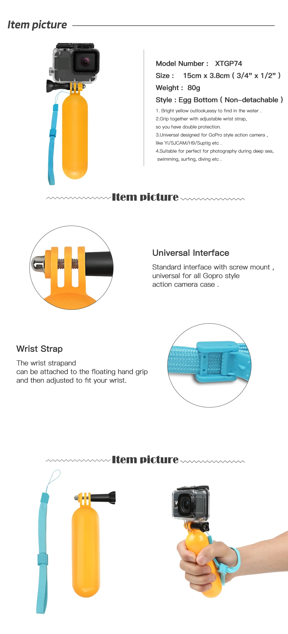 Совместим со всеми экшн-камерами Поплавок бар Размер: 15,5 см x 6,5 см x 3,8 см.Цвет: желтыйПредназначен для хранения камеры с водонепроницаемым плавающим корпусом на воде.