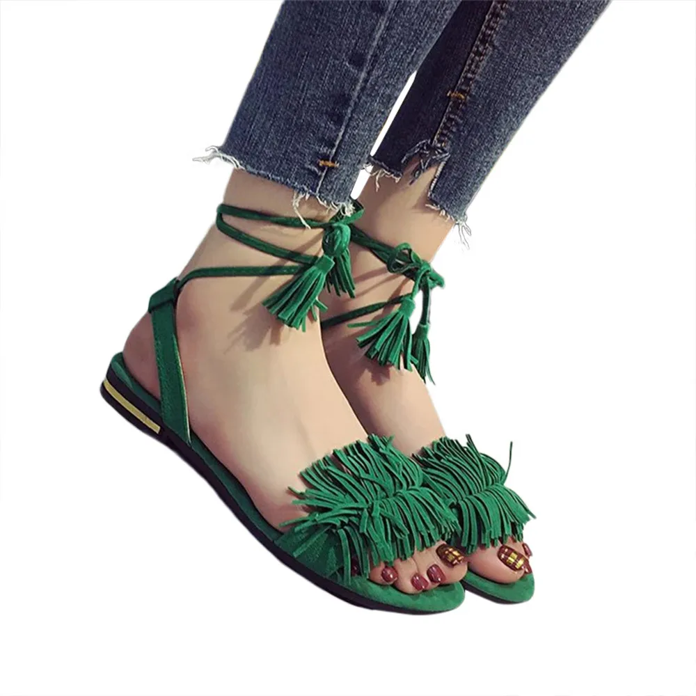 Женская модная удобная повседневная пляжная одеждаТвердыйЦвета Нескользящая обувь на плоской подошве с кисточкамиШнуровкаОбувь