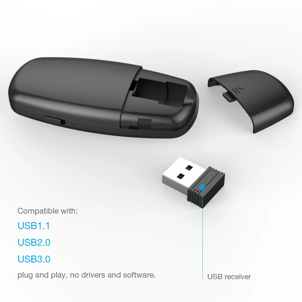 Можно использовать его подключи и работай, драйвер не нужен. Usb-приемник расположен на задней стороне ведущего устройства. Дизайн с компактным размером, легко использовать и носить с собой везде.