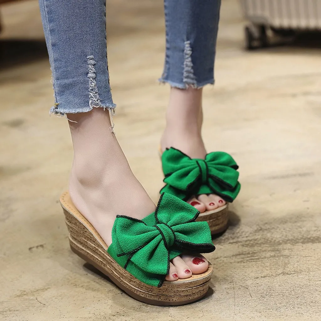 Женские модные однотонные шлепанцы на танкетке с бантом; Босоножки с открытым носком; обувь на каблуке «рюмочка»