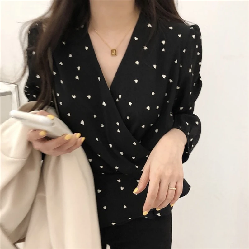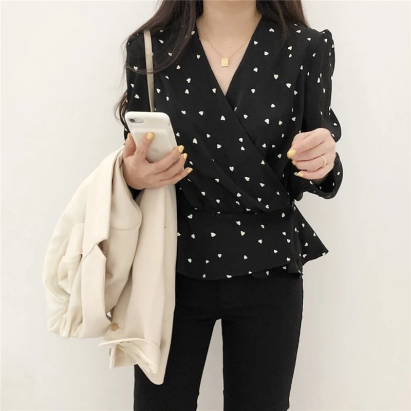 Женские летние топы с v-образным вырезом, Корейский Японский консервативный стиль, базовый женский топ с принтом Love, Приталенный топ с баской, блузка, рубашки