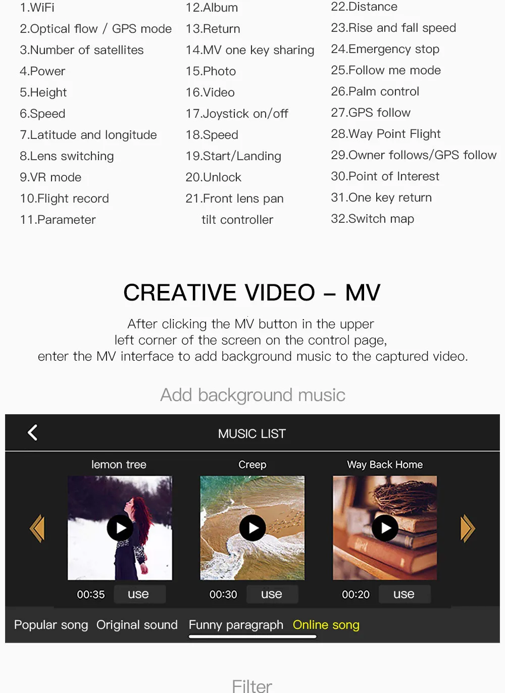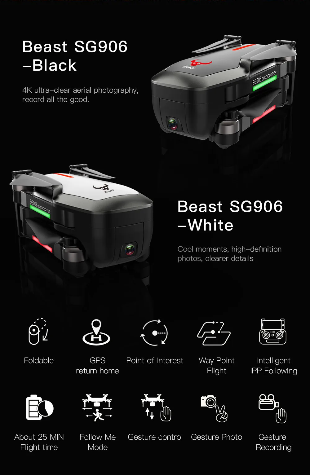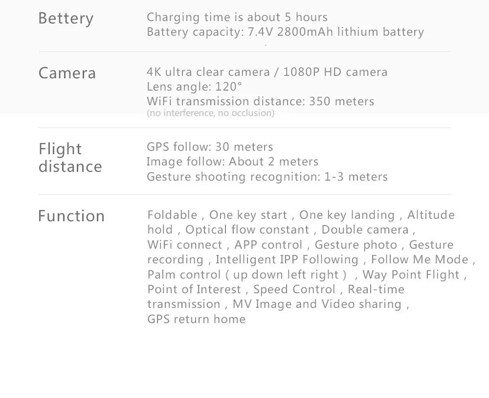 Функция: складная, запуск одной кнопкой, посадка одной кнопкой, удержание высоты, постоянная оптическая подача, двойная камера, подключение Wi-Fi, управление приложением, фото жестов, запись жестов, следующее IPP Inteiiigent, следуя режиму me, управление ладонью (вверх вниз влево вправо), полет точки пути, точки заинтересованности, контроль скорости, Передача в реальном времени, MV изображение и видео обмен, GPS возврат домой.