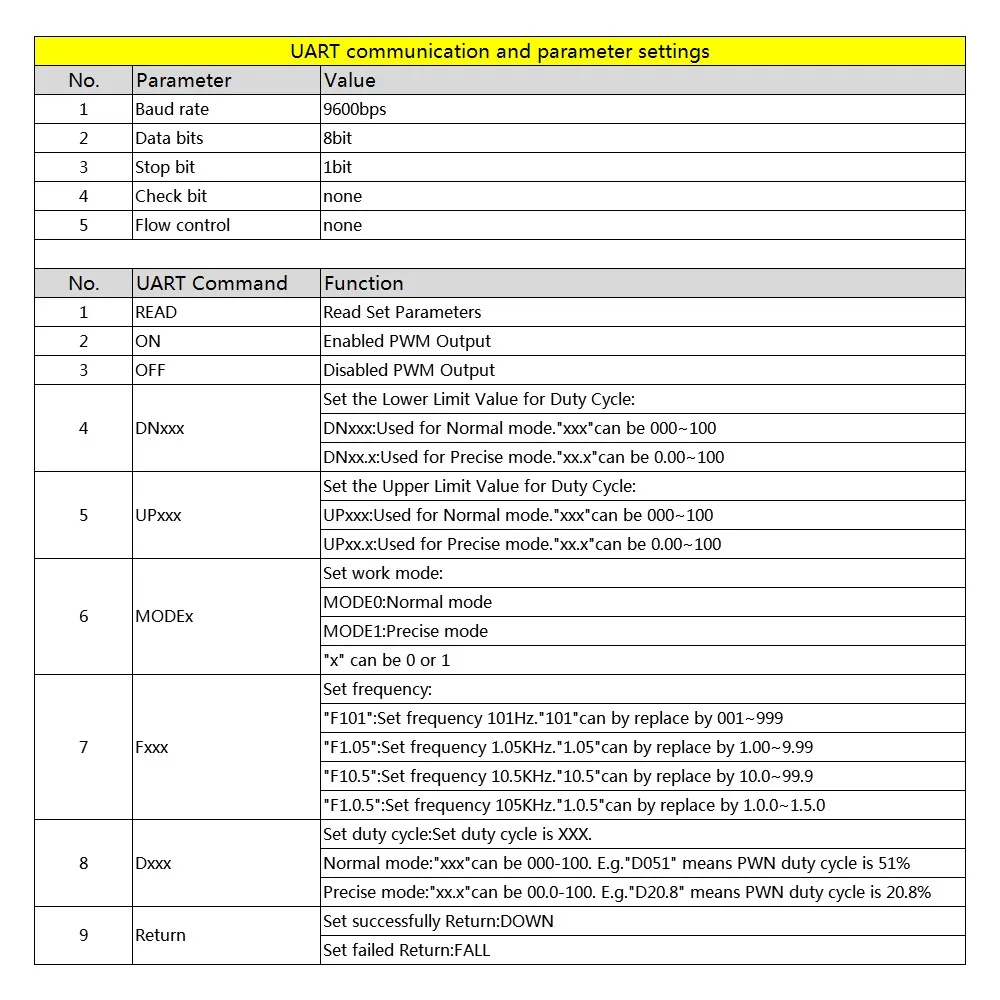 Руководство пользователя трех канал ПВМ Характеристики модуля: 1. Выход из трех-канал ПВМ в одно и то же время, Регулируемая частота, 3-канальный блок питания с частоты Выход последовательного, коэффициент заполнения может быть самостоятельно регулируется, подходит для большинства случаев 2. ЖК-дисплей может отображать частоту и рабочий режим datio, легко переносимый; 3. Широкий диапазон частот, высокая точность; 4. Поддержка последовательной работы Описание модуля Три-канал ПВМ является выводиться, широкий диапазон воспроизводимых частот и скважность может быть отрегулировано по отдельности; Частота делится на четыре области, автоматическое переключение: 1.XXX (без запятой): 1 Гц шаговый блок, диапазон: 1 Гц ~ 999 Гц; 2.X.XX (десятичная находится в сотни место): 0,01 кГц шаговый блок, диапазон: 1,00 кГц ~ 9,99 кГц; 3.X.XX (десятичная находится в десятки тысяч место): 0,1 кГц шаговый блок, диапазон: 10,0 кГц ~ 99,9 кГц; 4.X.X.X (десятичное значение находится в месте): 1 кГц шаговый блок, диапазон: 1 кГц ~ 150 кГц; Е. Г., дисплей частоты: 100 представляют Пульс 100 Гц; 1,01 представляют Пульс 1,01 кГц; 54,1 представляют Пульс 54,1 кГц 1.2.4 представляют Пульс 124 Гц Измерьте Диапазон значений dutyfactor: 0 ~ 100%,100% представлен A0 %. Все параметры могут быть автоматически сохранены в чехол power cut. 、 Настройки параметров Модуль имеет 8 независимых клавиш, используемых для настройки частоты и коэффициента работы, поддерживает короткое нажатие (увеличение или уменьшение единицы) и длительное нажатие (быстрое увеличение или уменьшение), очень простое, установите параметры автоматически для сохранения, потери мощности. 3-сторонний выход коэффициента загрузки кнопка может быть нажата в одно и то же время, в режиме реального времени, жидкокристаллический дисплей является последним нажата кнопка коэффициента загрузки, в режиме реального времени, оксфордская ткань очень сильная, может использоваться как простое сканирование коэффициента дорожного движения. Параметры модуля: 1. Рабочее напряжение: 3,3 ~ 30V; 2. Диапазон частот: 1 Гц ~ 150 кГц; 3. Точность частоты: в каждом диапазоне точности составляет около 2% 4. Грузоподъемность сигнала: выходной ток может быть около 5 ~ 30 мА 5. Амплитуда выхода: амплитуда ШИМ и напряжение питания равное 6. Температура окружающей среды:-20 ~ + 70 ℃. Область применения: 1. Используйте d в качестве генератора сигналов квадратной волны для генерации квадратного волнового сигнала для разработки и использования экспериментов 2. Используется для генерации квадратного волнового сигнала для управления драйвером двигателя; 3. Генерирует регулируемые импульсы для MCU использования; 4. Генерирует Регулируемый пульс, цепь управления (PWM затемнения скорости и других приложений). Оригинальная команда UART Скорость передачи данных: 9600 бит/с длина данных: 8 Стоп-биты: 1 Контрольная цифра: нет Управление потоком: нет 1. Установите частоту ШИМ «F101»: установленная частота 101 Гц (001 ~ 999) «F1.05»: Установите частоту 1,05 кГц (1,00 ~ 9,99) «F10.5»: Установите частоту 10,5 кГц (10,0 ~ 99,9) «F1.0.5»: установленная частота 105 кГц (1.0.0 ~ 1.5.0) 2. Установите коэффициент мощности PWM "DX:YYY": установить PWM отношение пошлины x: (1 ~ 3) PWM серийный номер, YYY: (000 ~ 100) Коэффициент пошлины; Например, d1:050, установить 1th PWM коэффициент пошлины до 50% 3. Прочитайте параметры настройки Отправьте строку «чтение», чтобы прочитать параметры настройки. Формат сообщения: F156,D1:052,