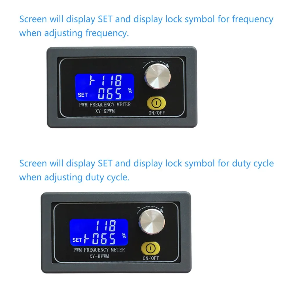1. Описание: XY-KPWM генератор сигналов-это устройство, которое обеспечивает электрические сигналы на различных частотах, квадратных волнах и выходных уровнях. Используется в качестве источника сигнала или источника возбуждения для тестирования. Широко используется в производственной практике и технологии. 2. Особенности: 1>. С внешним корпусом 2>. ЖК-дисплей высокой четкости 3>. Поддержка UART 4>. Поддержка регулировки частоты 5>. Поддержка регулировки рабочего цикла 6>. Высокая точность обнаружения 7>. Поддержка функции отключения памяти 8>.1 канал ПВМ выход 9>. Двойной режим работы 10>. Ручка поддерживает функцию блокировки, чтобы избежать неправильной работы 11>. Поддержка включения вывода 3. Параметры: 1>. Название продукта: XY-KPWM PWM генератор сигналов; 2>. Модель: XY-KPWM; 3>. Работа Напряжение: DC 3,3 V-30V; 4>. Частотный диапазон (нормальный режим):1 Гц ~ 150 кГц; 5>. Диапазон частот (точный режим):1 Гц ~ 15 кГц; 6>. Точность частоты: 2%; 7>. Точность рабочего цикла: 1% при нормальном режиме; 8>. Точность рабочего цикла: 0.1% в точном режиме; 9>. Диапазон рабочего цикла: 0.00%-100%; 10>. Выходной ток: около 5-30 мА; 11>. Амплитуда выхода: то же, что и входное напряжение; 12>. Рабочая температура:-40 ℃ ~ 85 ℃; 13>. Рабочая влажность: 0% ~ 95% относительной влажности; 14>. Размер: 79*43*37 мм; 4. Диапазон набора частот: Существует два режима работы, поэтому он имеет два диапазона частот. Нормальный режим: Частотный диапазон 1 Гц ~ 150 кГц. Диапазон рабочего цикла 000%-100%. Точность рабочего цикла 1%. Точный режим: Диапазон частот 1 Гц ~ 15 кГц. Диапазон рабочего цикла 0.00%-100%. Точность рабочего цикла 0.1%. Введите интерфейс настроек при коротком нажатии поворотного переключателя в нормальном рабочем состоянии для выбора диапазона частот. Поворотный потенциометр для установки значения частоты. Удерживайте поворотный переключатель в течение 10 секунд, чтобы переключить обычный режим и точный режим. Удерживайте нажатой в течение 5 секунд для фиксации параметров, чтобы защитить параметры от изменения. Обратите внимание на положение, в котором Десятичная точка движется при поворотном потенциометре .. Дисплей 'XXX'. Нет десятичной точки, минимальная частота-1 Гц. Диапазон частот-1 Гц ~ 999 Гц. Дисплей X.XX'. Запятой-предпоследний, минимальная частота 0,01 кГц. Диапазон воспроизводимых частот составляет 1,00 кГц ~ 9,99 кГц. Дисплей 'XX.X'. Запятой является третье, минимальная частота 0,1 кГц. Диапазон воспроизводимых частот составляет 10,0 кГц ~ 99,9 кГц. Дисплей 'X.X.X '. Десятичная точка полностью горит, минимальная частота-1 кГц. Частотный диапазон-1 кГц ~ 150 кГц. Например: Дисплей '100 'означает частоту выхода PWM 100 Гц; Дисплей '1.91 'означает, что выходная частота PWM составляет 1,91 кГц; Дисплей '52.1 'означает, что выходная частота PWM составляет 52,1 кГц; Дисплей '1. 3,4 'означает, что выходная частота PWM составляет 134 кГц; 5. Диапазон набора рабочего цикла: Короткое нажатие потенциометра для выбора рабочего цикла и поворотного потенциометра для установки значения рабочего цикла. 6. Используйте шаги: 1>. Подключение к источнику питания; 2>. Нажмите поворотный переключатель в течение 10 секунд для переключения нормального режима и точного режима; 3>. Короткий поворотный переключатель для установки частоты и изменения значения с помощью вращающегося переключателя; 4>. Нажмите поворотный переключатель в течение 2 секунд, чтобы установить рабочий цикл; 5> удерживайте нажатие в теч