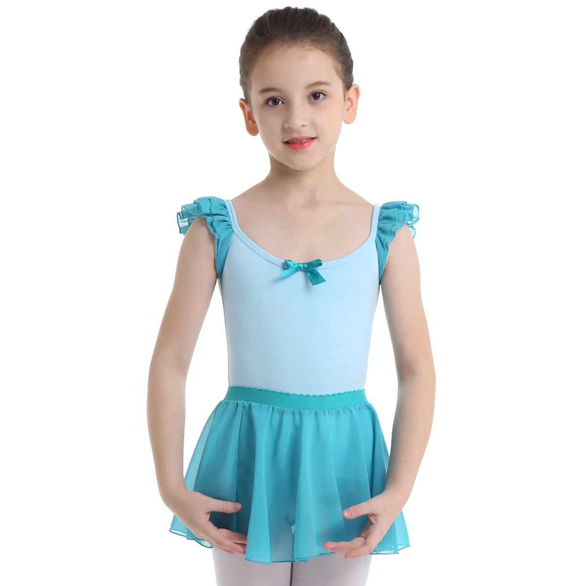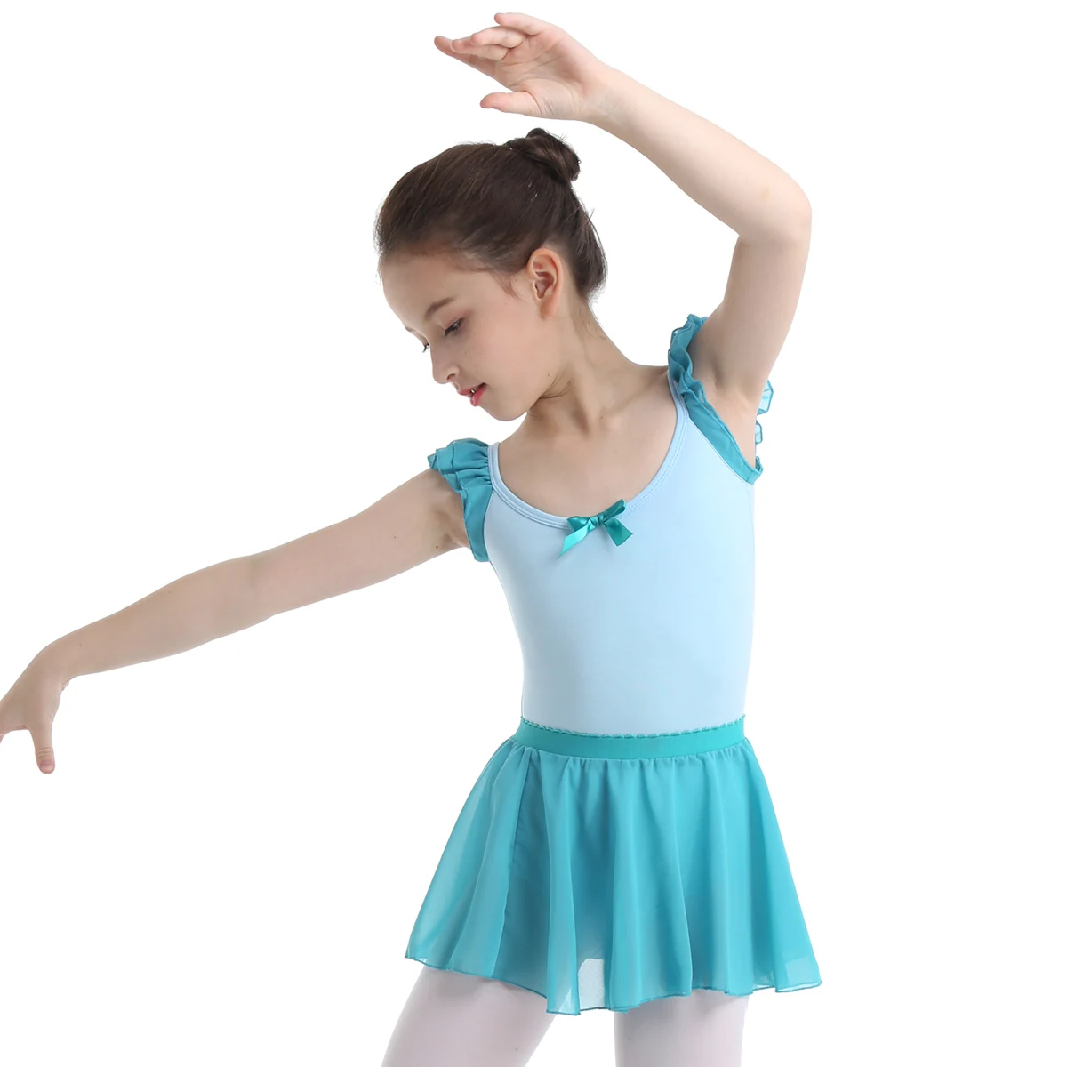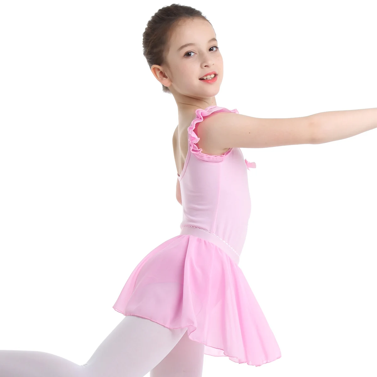 Платье изготовлено из полиэстера и хлопка, удобно носить, стирать вручную. Таблица размеров означает возраст для девочек, но только для общего руководства. U-образный вырез с несъемным бантом спереди, бретельки отделаны гофрированным шифоновым подолом, милым и милым. В комплекте шифоновая юбка с эластичной резинкой на талии. Подходит для занятий танцами, гимнастическое упражнение, выступления на сцене и т. д.