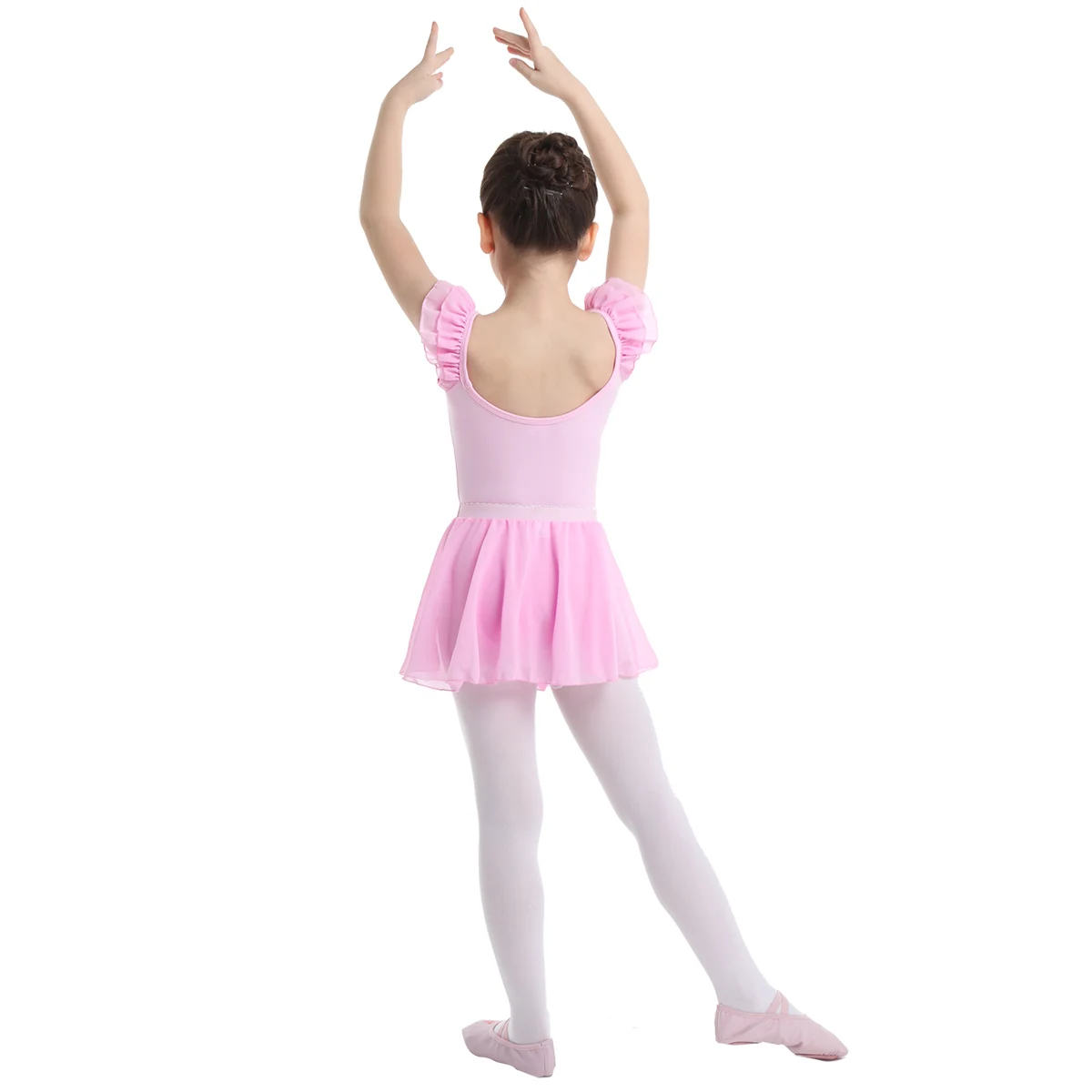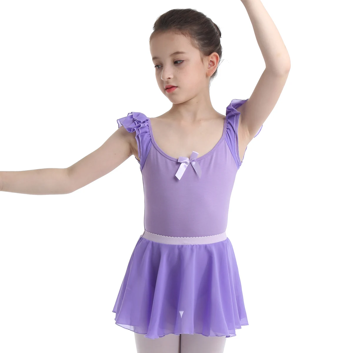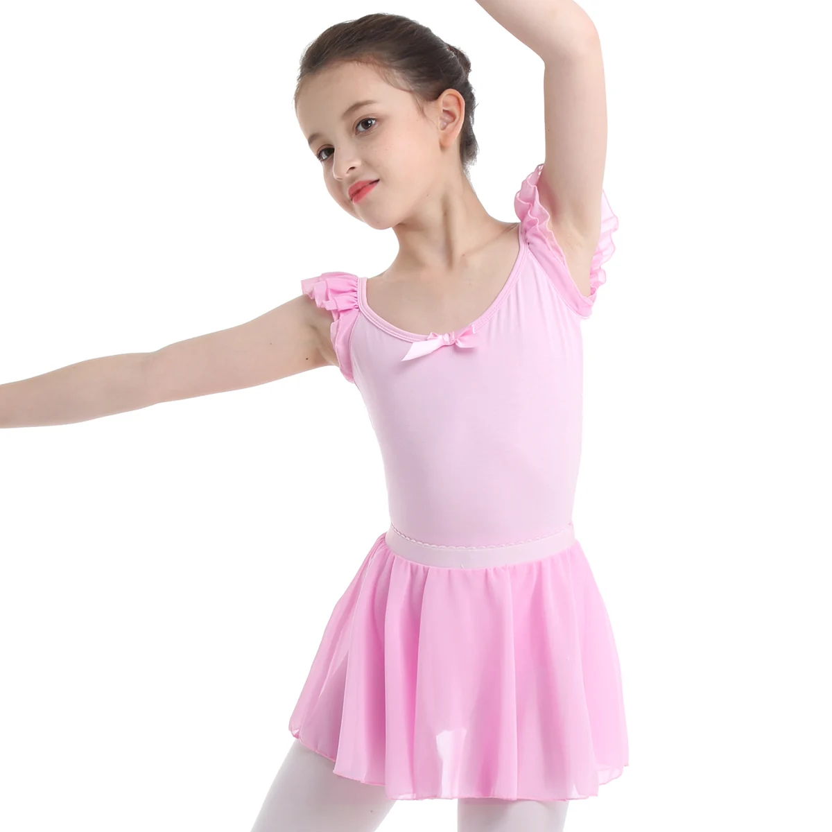 Платье изготовлено из полиэстера и хлопка, удобно носить, стирать вручную. Таблица размеров означает возраст для девочек, но только для общего руководства. U-образный вырез с несъемным бантом спереди, бретельки отделаны гофрированным шифоновым подолом, милым и милым. В комплекте шифоновая юбка с эластичной резинкой на талии. Подходит для занятий танцами, гимнастическое упражнение, выступления на сцене и т. д.