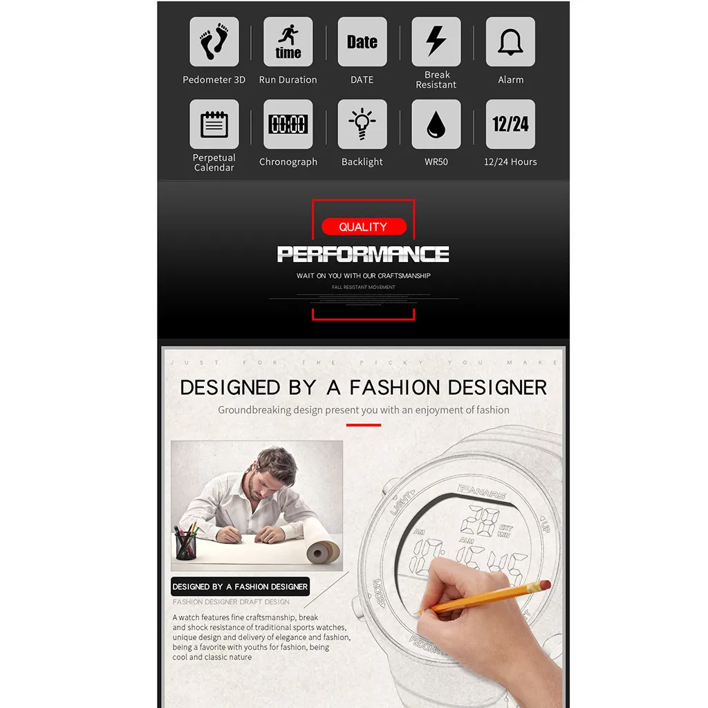 Чехол Материал: высокого качества из АБС-пластикаМатериал ремешка: Высококачественный Экологически чистый пластикМатериал нижней крышки: 304 Толстая нержавеющая стальМатериал зеркала: утолщенное и жесткое акриловое зеркалоПодходит для толпы: взрослыхДвижение: жидкокристаллический дисплей цифровой электронный механизмБатарея: CR2032Длина Часов: 250 ммДиаметр циферблата: 43,5 ммТолщина циферблата: 12,8 ммШирина ремешка: 23Пожалуйста, ознакомьтесь с вводом продукта в описании изображения для использования.Продукт содержит: