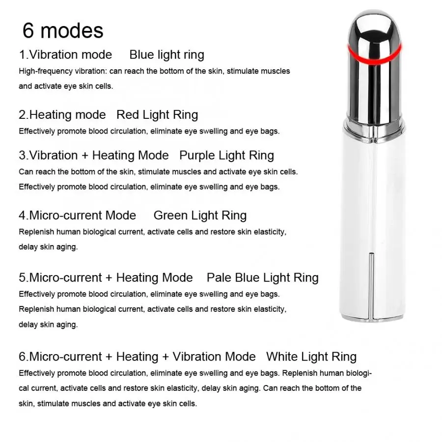 Нежная высокочастотная вибрация: может достигать нижней части кожи, стимулировать мышцы и активировать клетки кожи глаз. Горячий компресс с постоянной температурой: эффективно способствует циркуляции крови, устраняет отеки глаз и мешки для глаз, уменьшает тонкие линии, удаляет темные круги и снимает усталость глаз. Микро-ток: восполняет биологический ток человека, активирует клетки и восстанавливает эластичность кожи, задерживает старение кожи. 45 градусов наклонный металлический зонд дизайн адаптируется к контуру глаз и контуру губ. Один переключатель: Длительное нажатие на 3 s для включения и выключения. После загрузки Одно нажатие для одного режима. Зарядка через USB: одна полная нагрузка обеспечивает работу за 45 минут. Портативный размер, удобно носить с собой, когда и где это возможно.