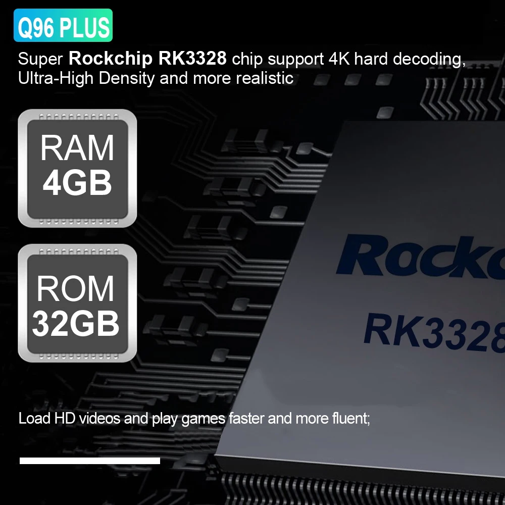 Работает от высокопроизводительного четырехъядерного процессора 3328, Q96 PLUS сможет воспроизводить видео 4K с декодированием H.265, H.264 и VP9. Он также оснащен HDR 10, HD 2.0a и Mali-450MP2 графическим процессором.