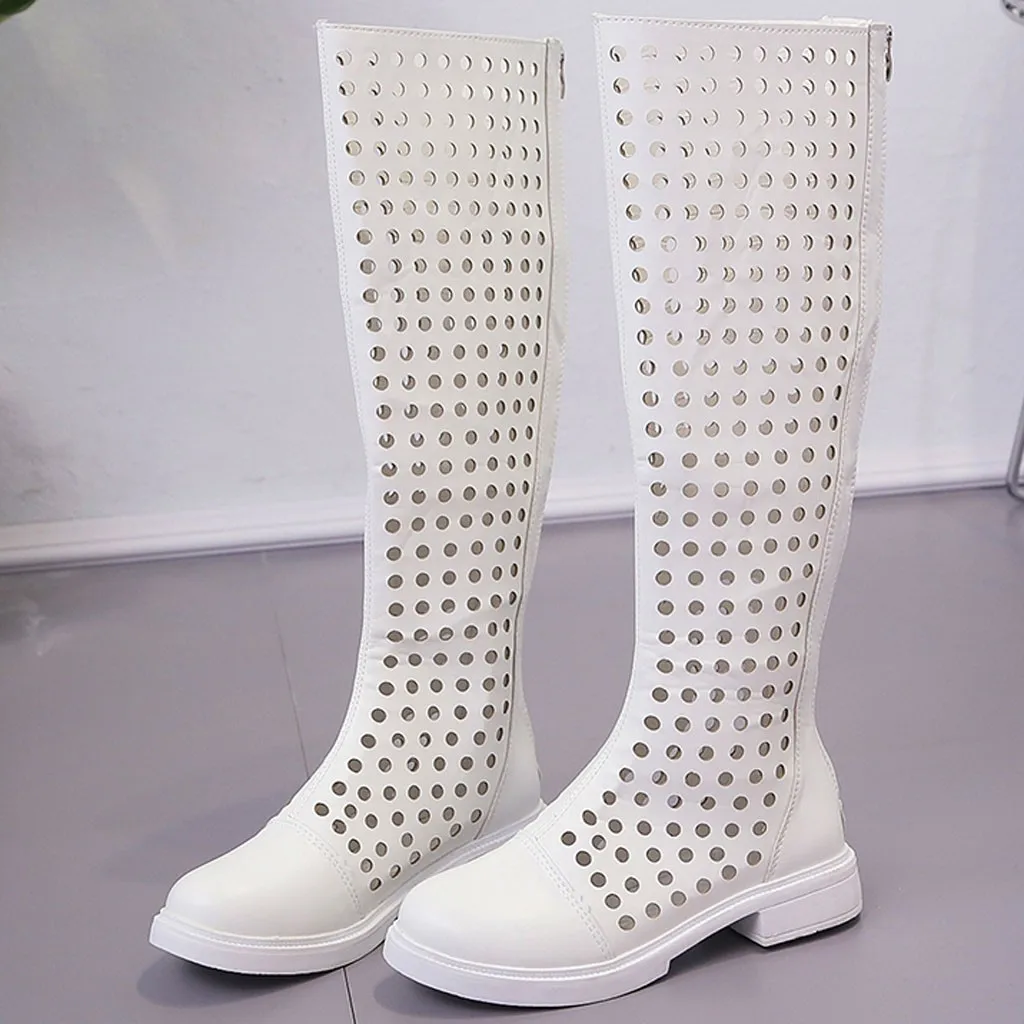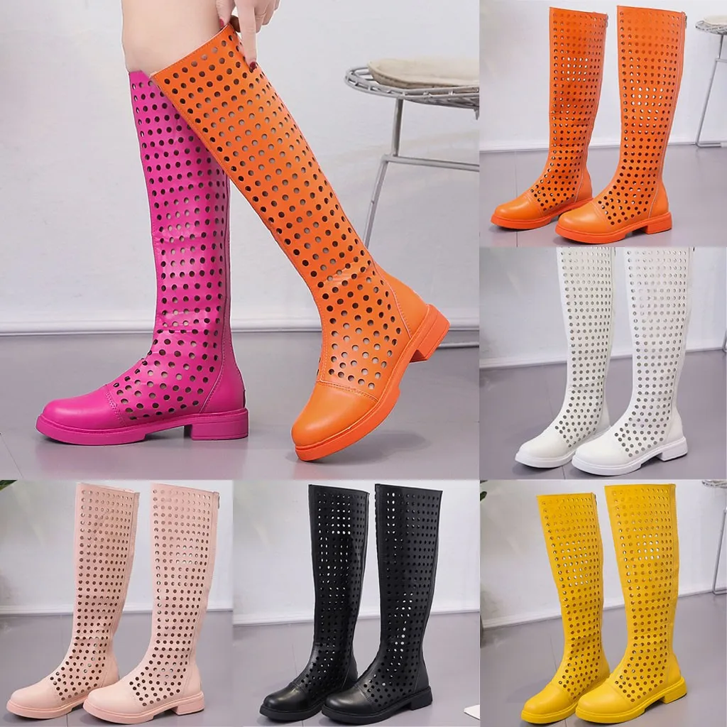 Женские летние сапоги до колена с перфорацией; Дышащая повседневная обувь на плоской подошве