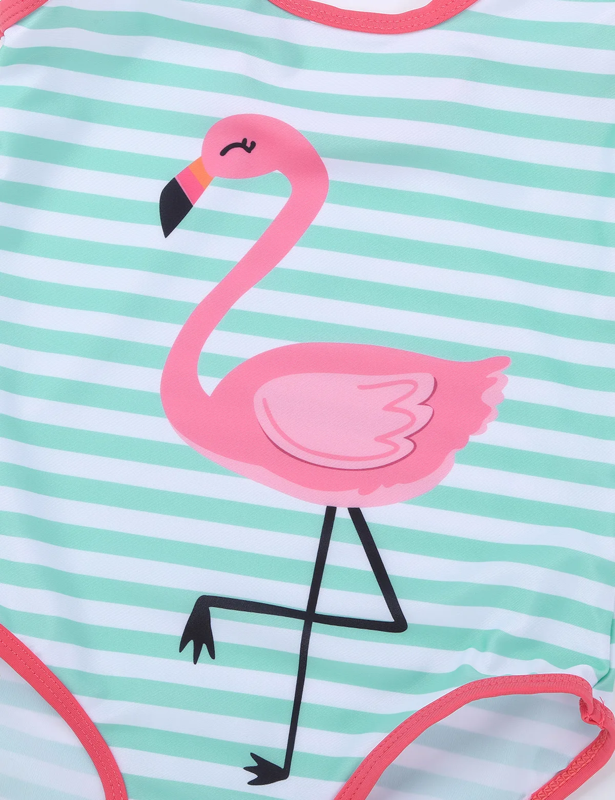 Широкие бретельки в полоску спереди с рисунком фламинго. Подкладка спереди и в промежности.