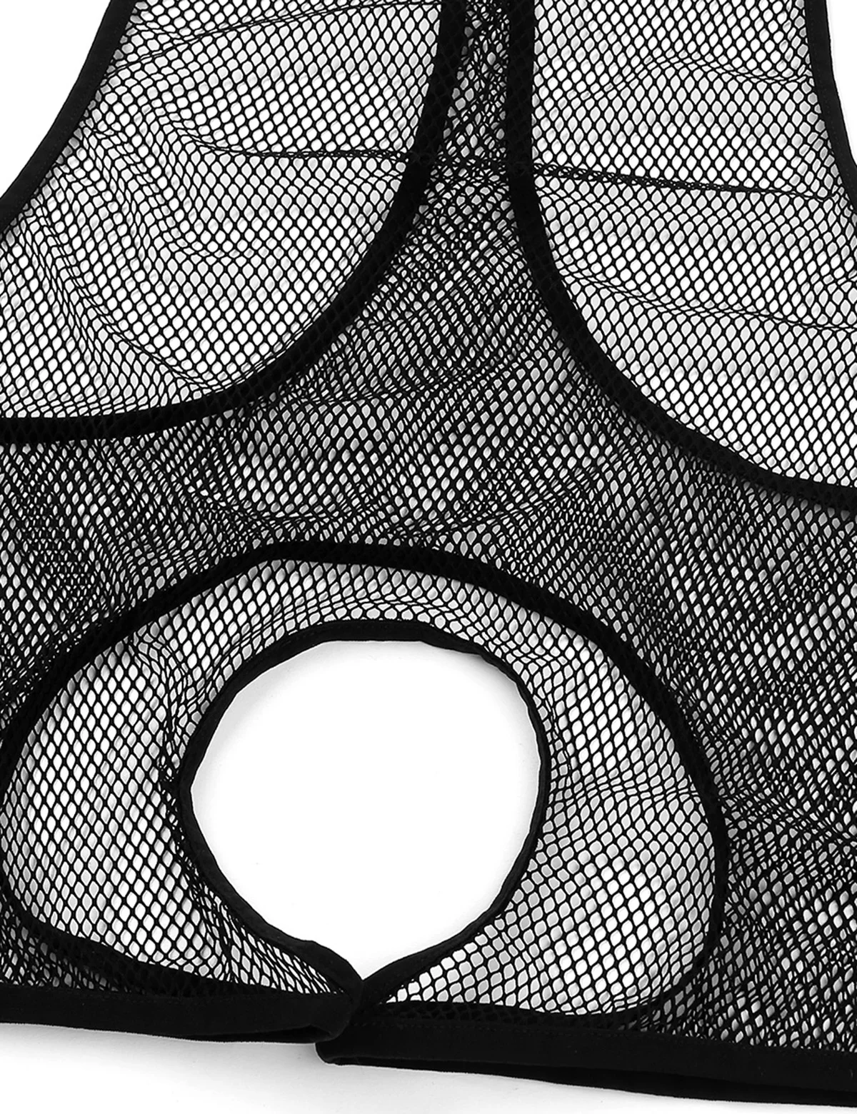 Без рукавов, с глубоким вырезом и без косточек, просвечивается в сетку, вырезается с двух сторон.